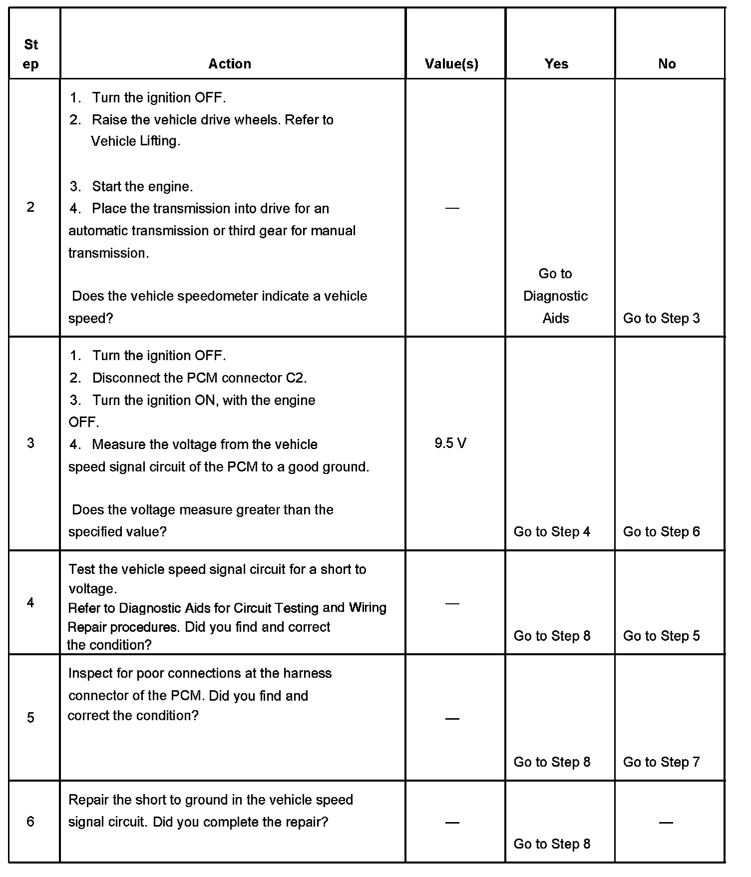 CIRCUIT DESCRIPTIONThe PCM creates the vehicle speed output signal by pulsing the circuit to ground. The PCM pulses the circuit at the same rate as the vehicle speed signal input. The PCM monitors the voltage on the vehicle speed output circuit. If the PCM determines the voltage is out of the normal operating range, a DTC sets.