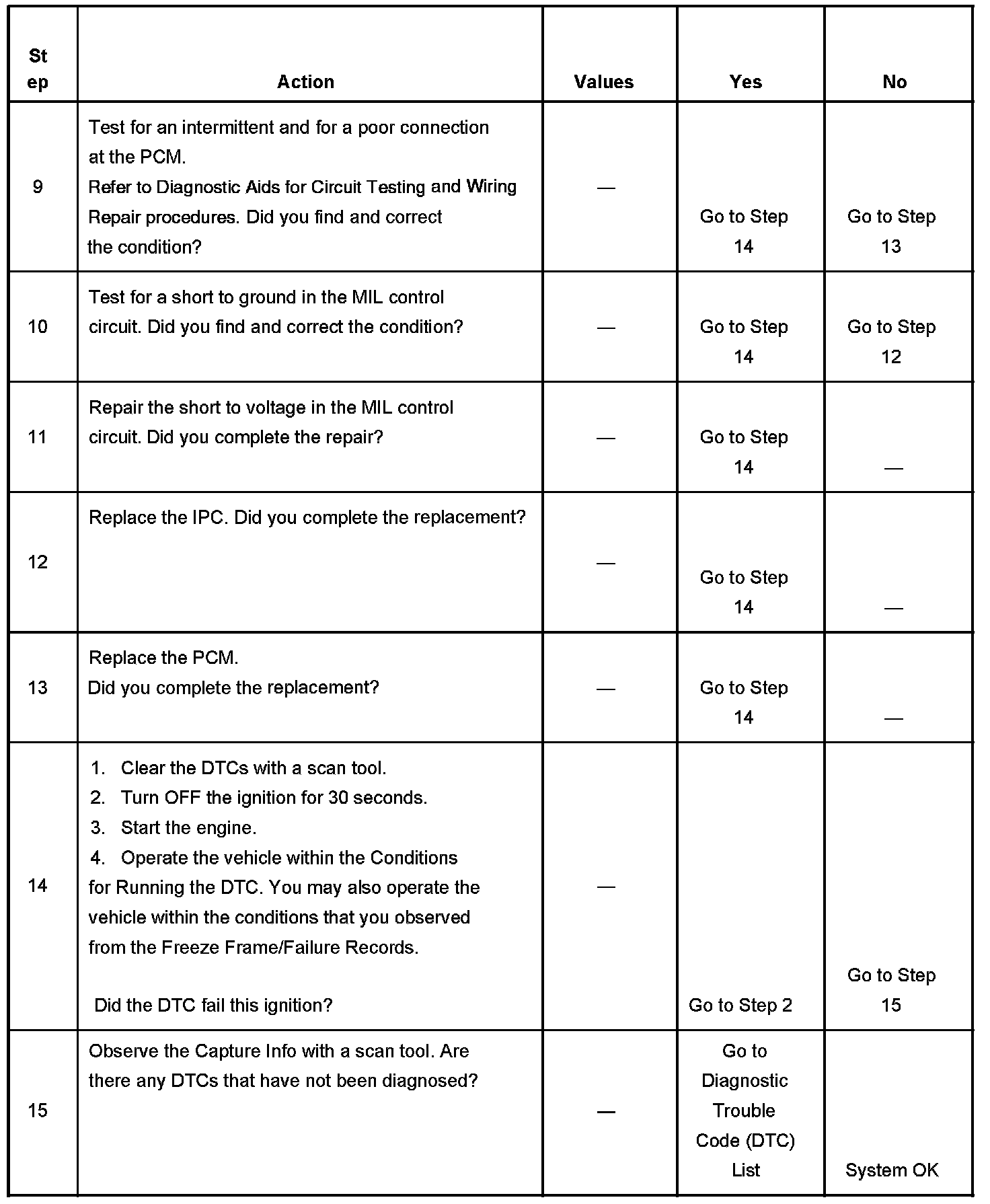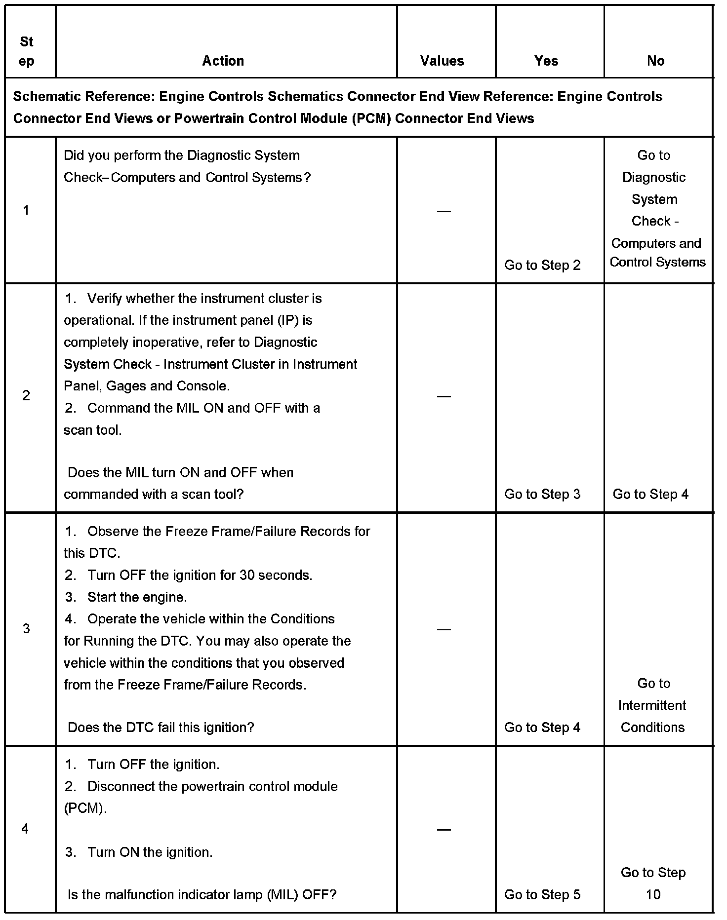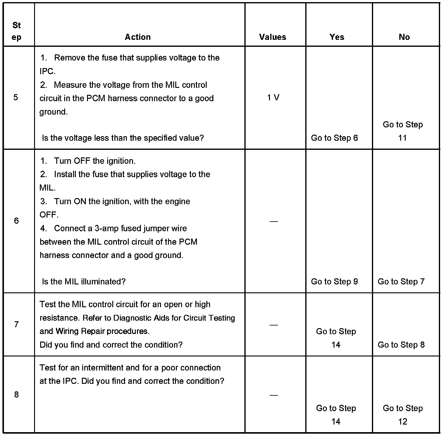 4. This step tests for a short to ground in the MIL control circuit. With the powertrain control module (PCM) disconnected and the ignition ON, the MIL should be OFF.