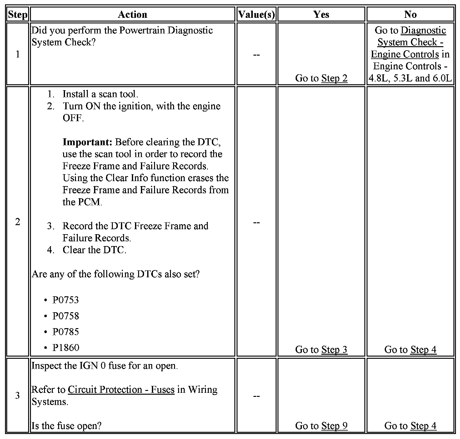 The numbers below refer to the step numbers on the diagnostic table.