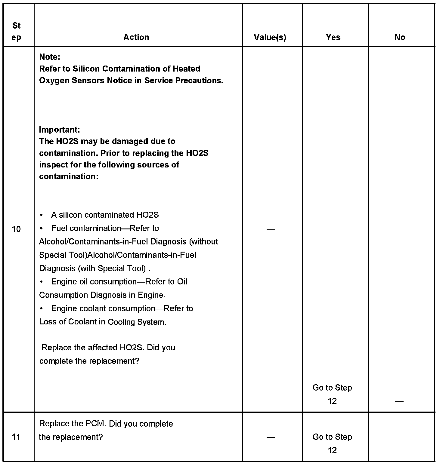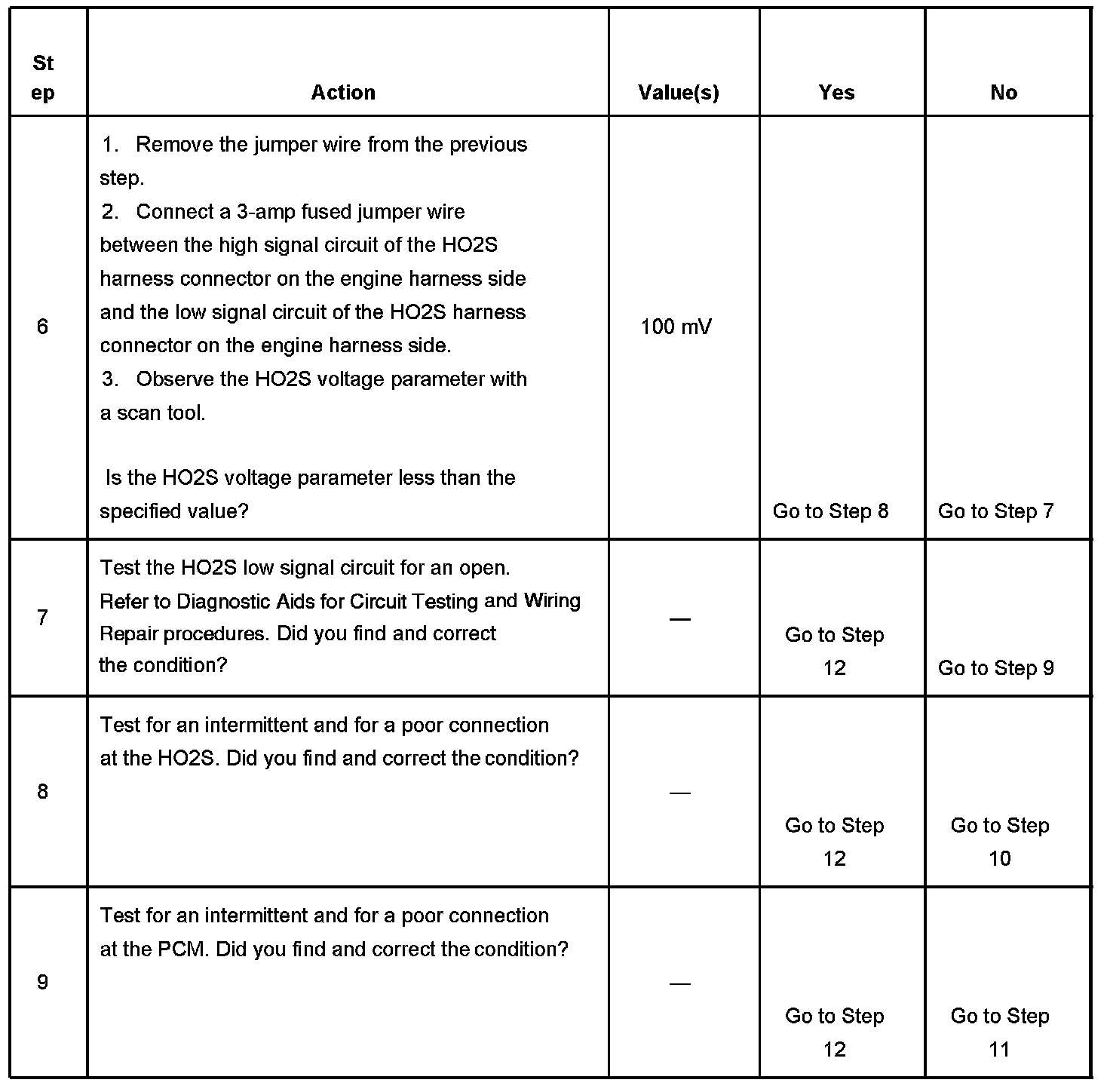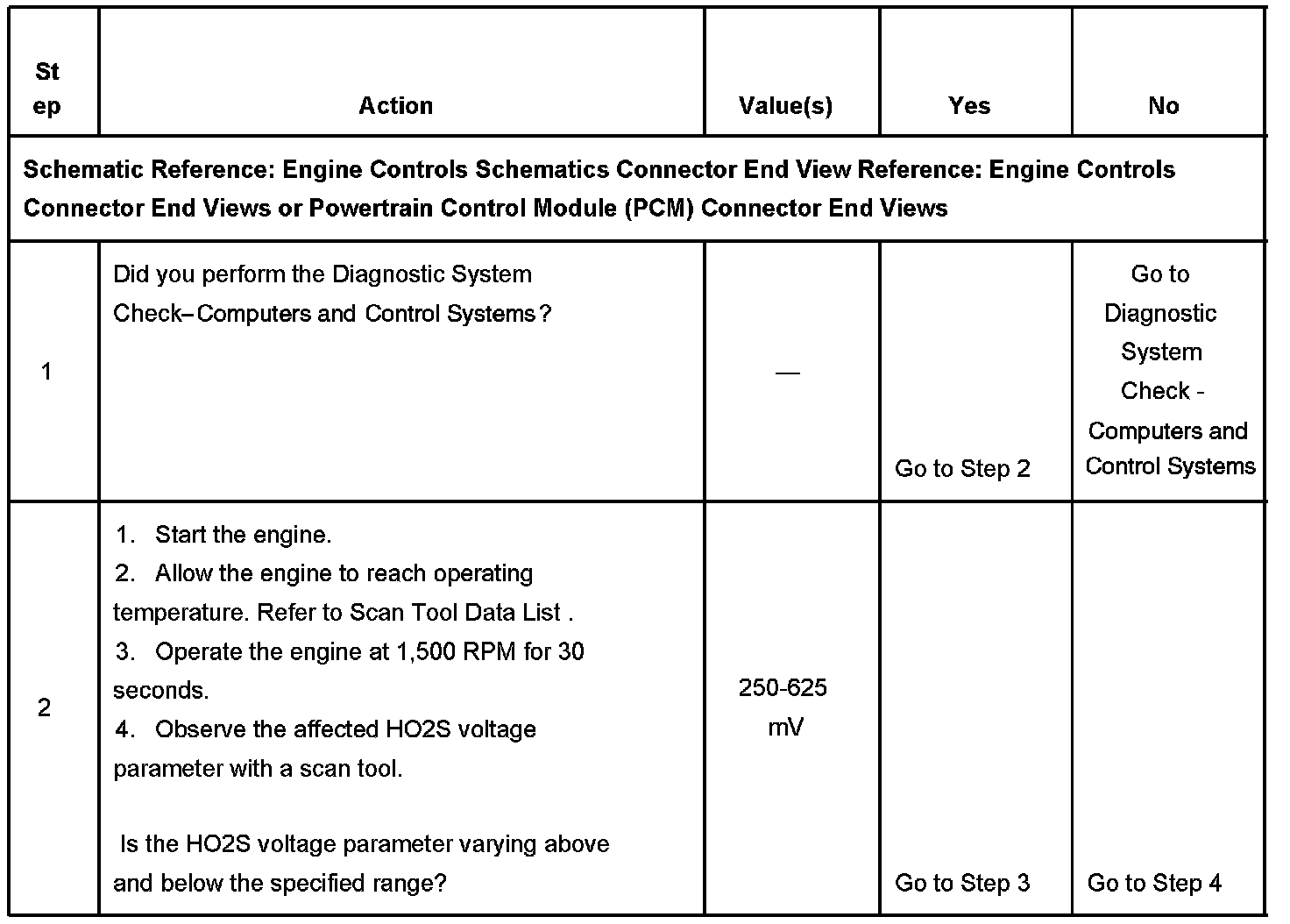 CIRCUIT DESCRIPTIONHeated oxygen sensors (HO2S) are used for fuel control and post catalyst monitoring. Each HO2S compares the oxygen content of the surrounding air with the oxygen content in the exhaust stream. The HO2S must reach operating temperature to provide an accurate voltage signal. Heating elements inside the HO2S minimize the time required for the sensors to reach operating temperature. The powertrain control module (PCM) supplies the HO2S with a reference, or bias, voltage of about 450 mV. When the engine is first started the PCM operates in open loop, ignoring the HO2S voltage signal. Once the HO2S reaches operating temperature and closed loop is achieved, the HO2S generates a voltage within a range of 0-1,000 mV that fluctuates above and below bias voltage. High HO2S voltage indicates a rich exhaust stream; low HO2S voltage indicates a lean exhaust stream. This diagnostic will only run once per ignition cycle. The PCM monitors the number of rich-to-lean and lean-to-rich transitions. A transition is defined as, the HO2S voltage changes from above 625 mV to below 250 mV or from below 250 mV to above 625 mV. If the PCM detects that the number of transitions were less than a specified value, DTCs P1133 or P1153 will set.