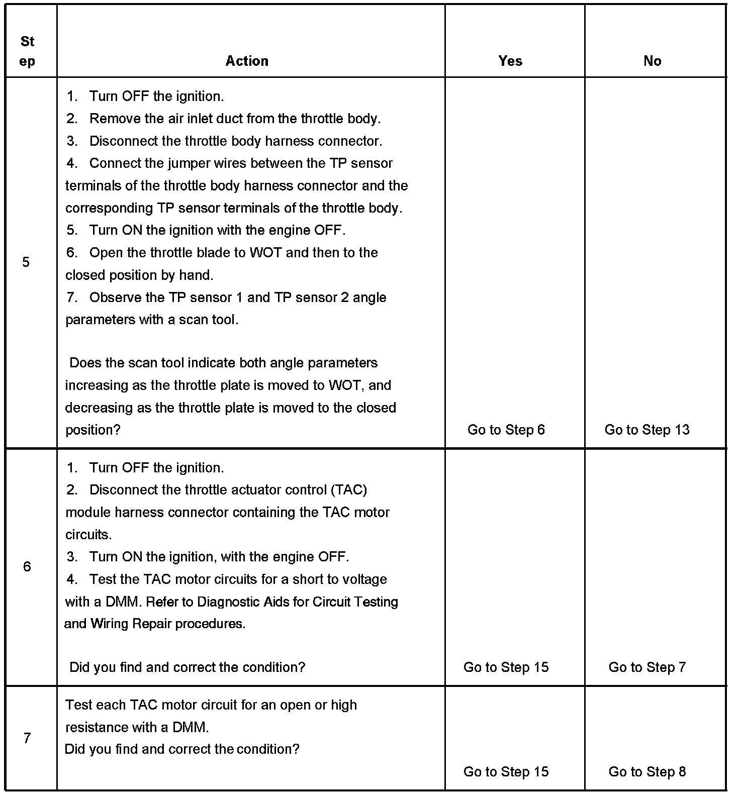 5. If the TP indicated angle does not follow the movement of the throttle blade, and no TP sensor DTCs are set, there is a mechanical condition with the throttle shaft or the TP sensor.