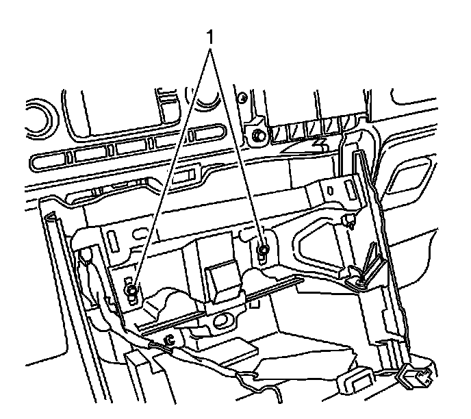 9. Reposition the inboard seat track trim (1) in order to gain access to the rear console side panel screw (2).
