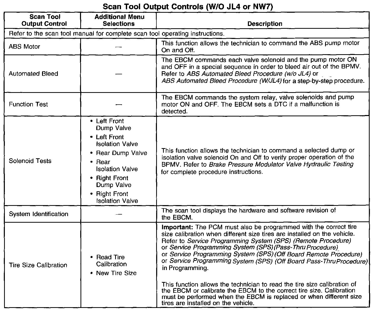 Scan Tool Output Controls (W/O JL4 or NW7):