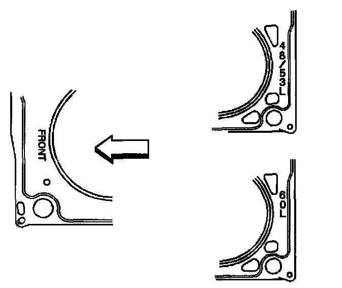 5. When properly installed, with FRONT on the left side, the tab on the cylinder head gasket should be located left of center or closer to the front of the engine.