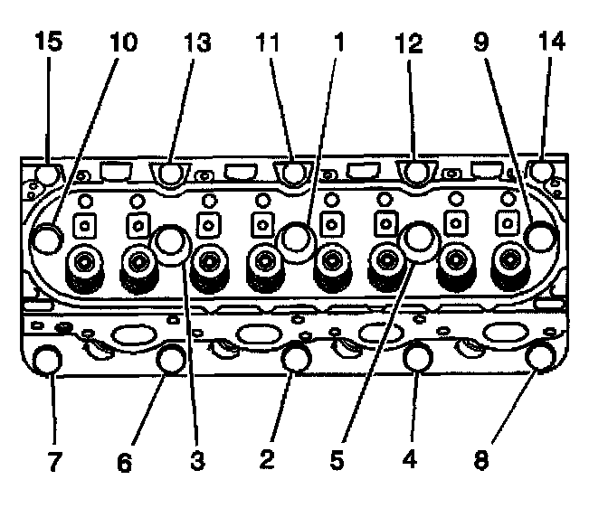 9.4. Tighten the Me bolts (11, 12, 13, 14, 15) to 30 Nm (22 ft. lbs.). Begin with the center bolt (11) and alternating side-to-side, work outward tightening all of the bolts.