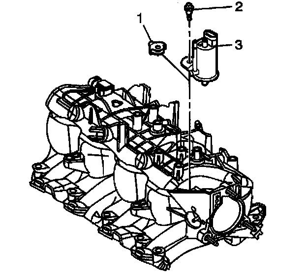 8. Install the Evaporative Emission (EVAP) purge solenoid (3), bolt (2), and isolator (1).