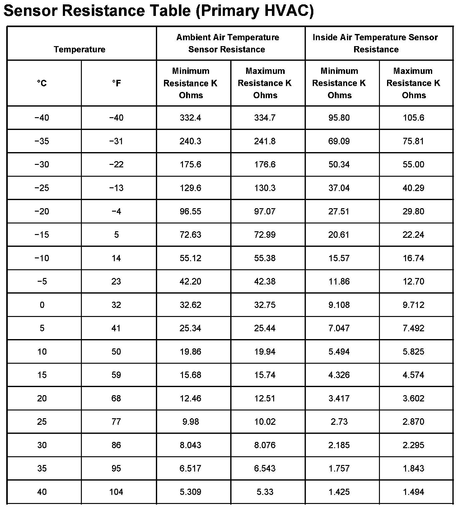 Sensor Resistance Table (Primary HVAC):