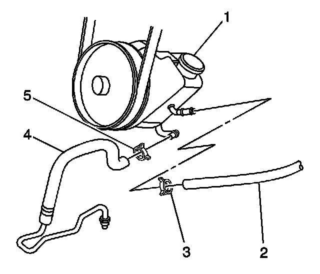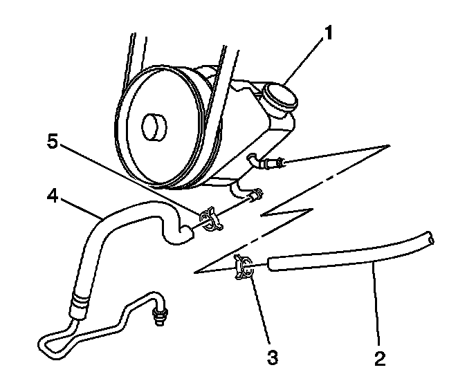 8. Remove the clamps (3,5) retaining the power steering return hoses to the power steering pump and remove the hoses.