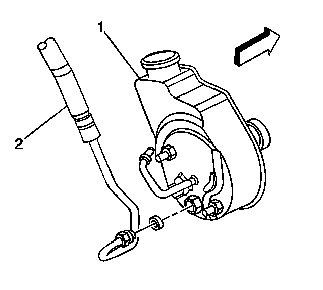 6. Remove the power steering pressure hose (2) from the power steering pump from underneath the vehicle.