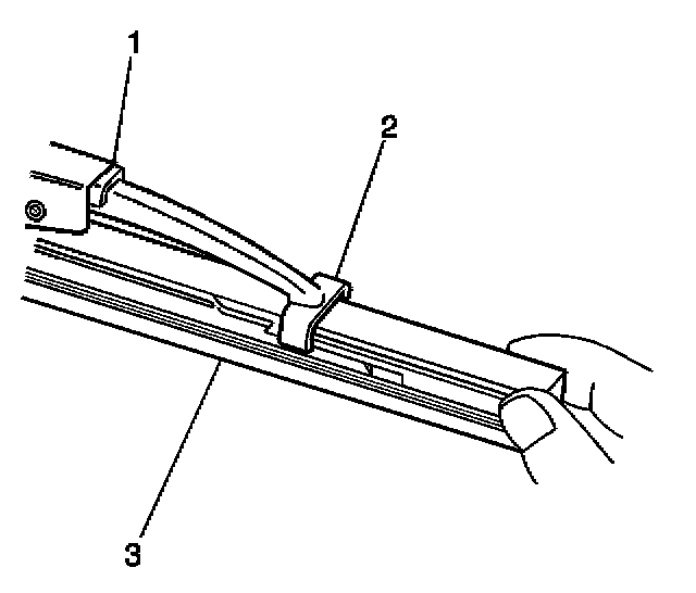3. Engage the bottom claw (2) of the wiper blade (1) into the notches in wiper blade element (3).