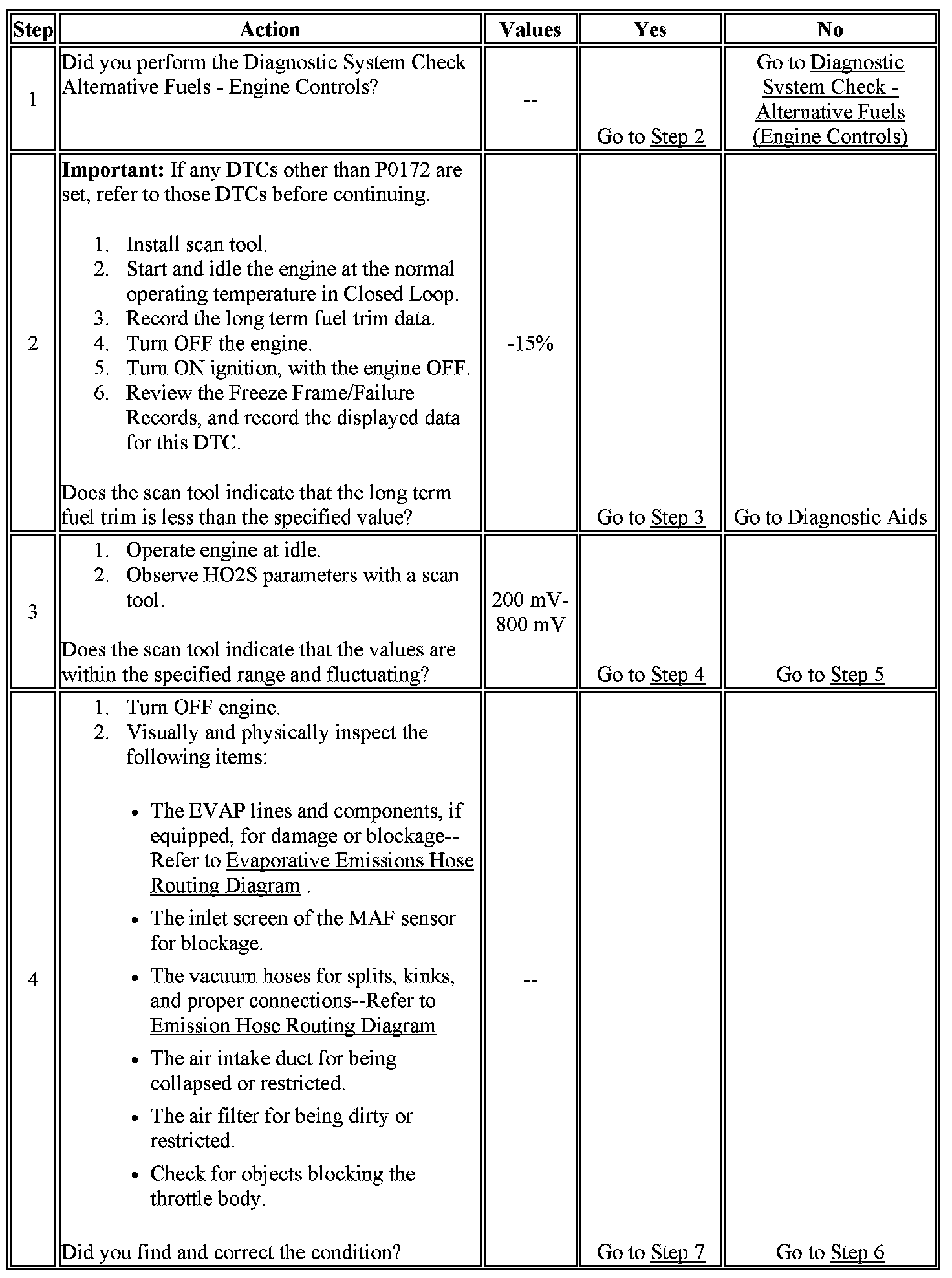 The powertrain control module (PCM) controls the air/fuel metering system in order to provide the best possible combination of driveability, fuel economy, and emission control. CNG Fuel delivery is controlled differently during Open and Closed Loop. During Open Loop the PCM determines fuel delivery based on sensor signals without oxygen sensor (O2S) input. During Closed Loop, the oxygen sensor inputs are added and used by the PCM to calculate short and long term fuel trim fuel delivery adjustments. If the O2S indicate a lean condition, the fuel trim values will be above 0 percent. If the O2S indicate a rich condition, the fuel trim values will be below 0 percent. Short term fuel trim values change rapidly in response to the heated oxygen sensor (HO2S) voltage signals. Long term fuel trim makes coarse adjustments in order to maintain an air/fuel ratio of 16.5:1 while operating on CNG. The fuel trim diagnostic will conduct a test to determine if a rich failure actually exists, or if excessive vapor from the evaporative emission (EVAP) canister is causing a rich condition. The PCM does not perform the excess vapor test on the dedicated CNG fuel system. If the PCM detects an excessively rich condition, DTC P0172 or P0175 sets.
