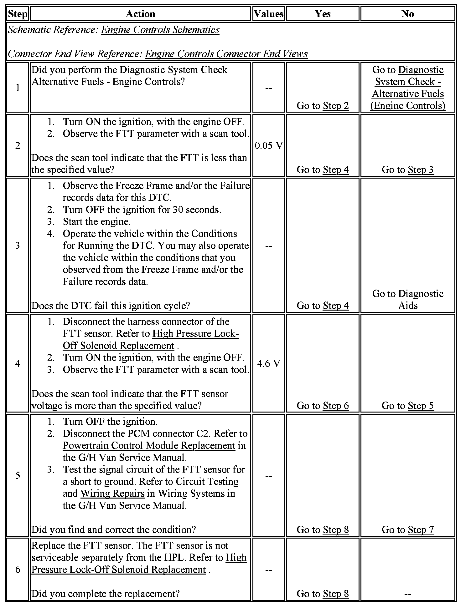The fuel tank temperature (FTT) sensor is a variable resistor that measures the temperature of the fuel in the CNG fuel tank. The PCM supplies 5 volts to the FTT signal circuit. This DTC sets when the FTT signal voltage is below the normal operating range of the sensor.