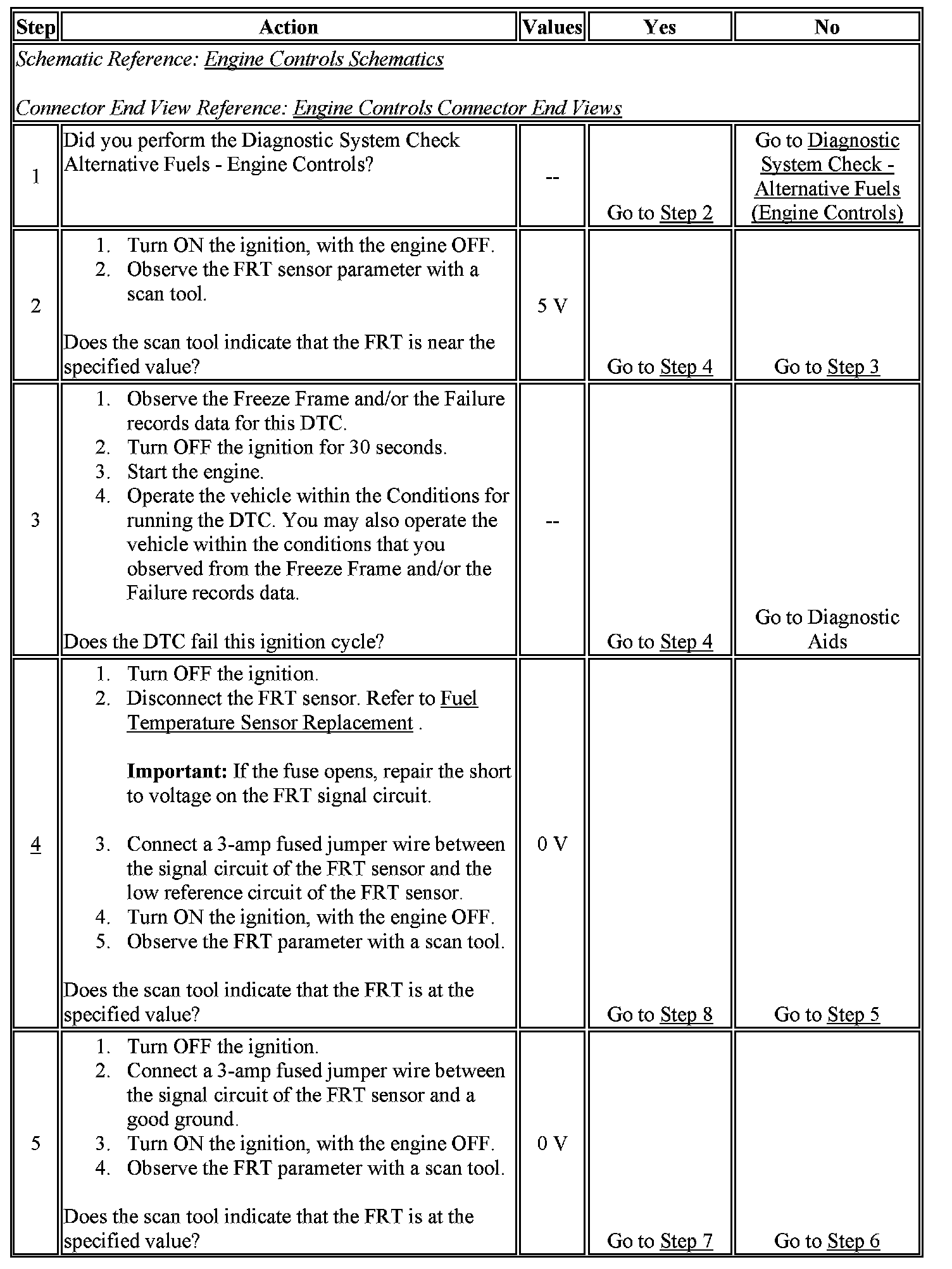 - Use the Temperature vs Resistance table in order to test the FRT sensor at various temperature levels in order to evaluate the possibility of a skewed sensor. A skewed sensor could result in a driveability condition. If the engine has sat overnight, the FRT sensor and the intake air temperature values should display within a few degrees. If the temperatures are not within 3°C (5°F), refer to Fuel Temperature Sensor Replacement.