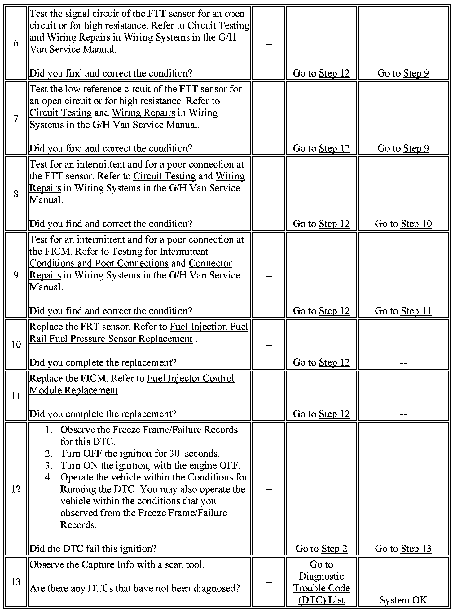 The fuel rail temperature (FRT) sensor is a variable resistor that measures the temperature of the fuel in the CNG fuel rail. The fuel injector control module (FICM) supplies 5 volts to the FRT signal circuit and supplies a ground to the low reference circuit. The FICM monitors the FRT sensor voltage and communicates the data to the PCM by a dedicated pulse width modulated (PWM) circuit. This DTC sets when the FRT signal voltage is above the normal operating range of the sensor.