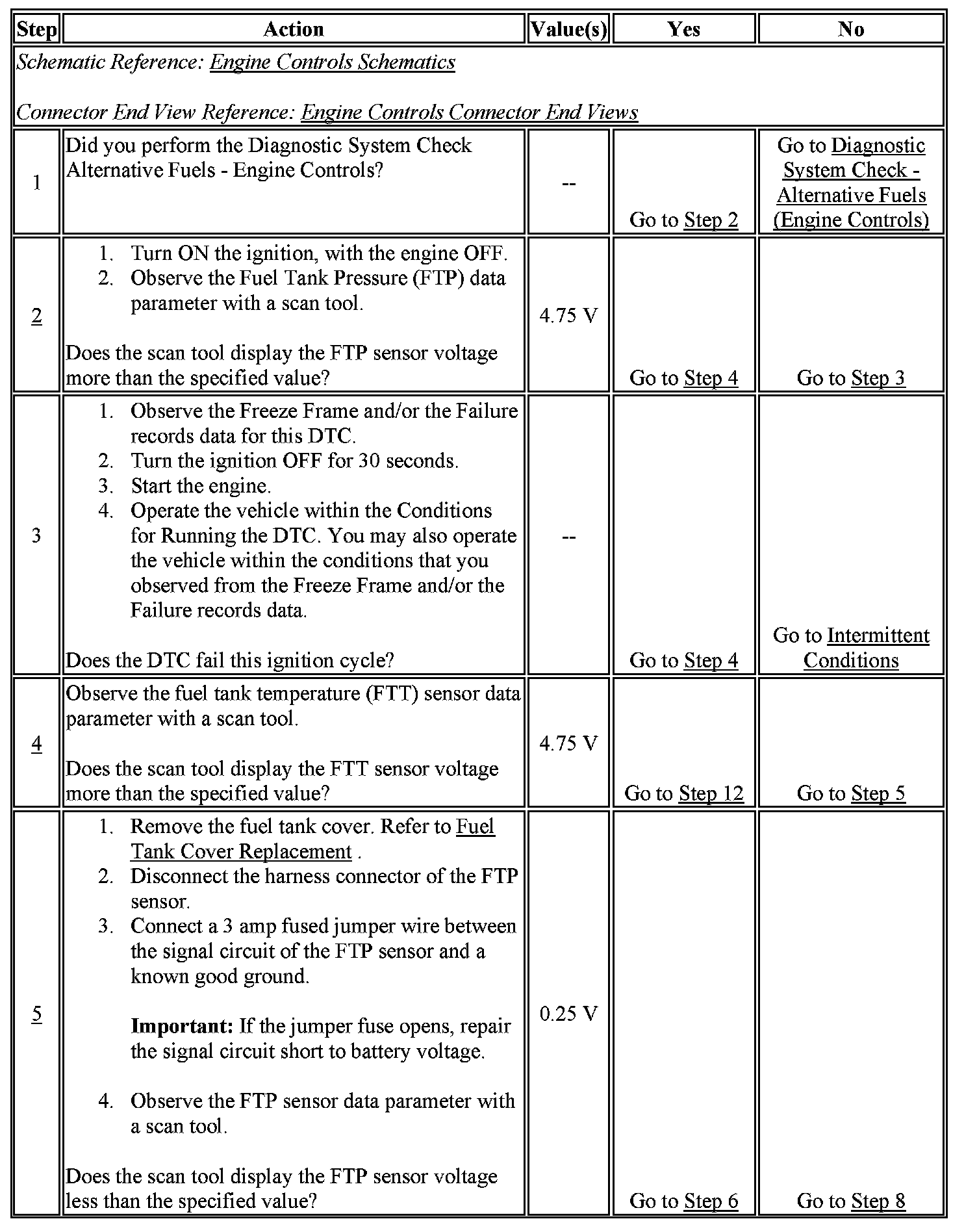 4. This step determines if an open sensor ground circuit condition is present. The FTP and FTT share a sensor ground. An open circuit between the splice and the ground terminal will cause both signal circuits to indicate high voltage.