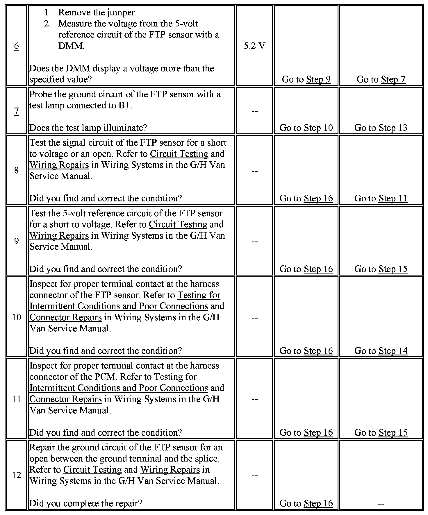 7. This step determines if an open sensor ground circuit between the harness connector of the FTP sensor and the splice is the cause of the condition.