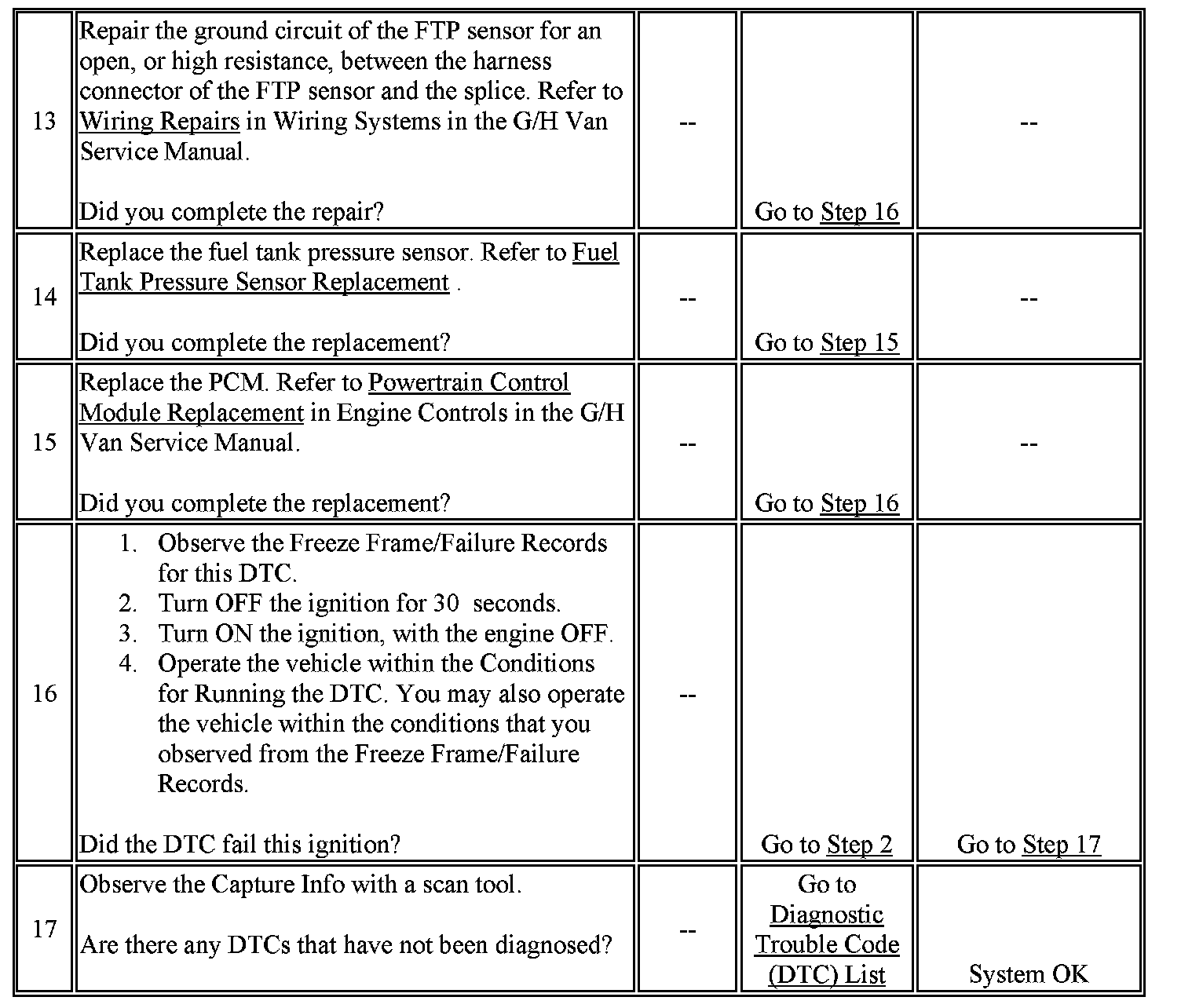 The numbers below refer to the step numbers on the diagnostic table.