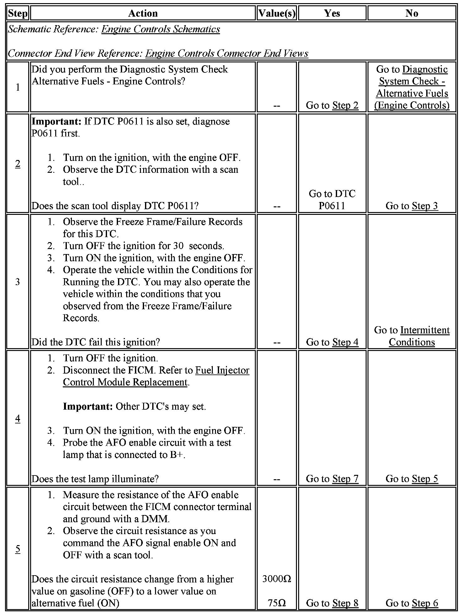 The powertrain control module (PCM) grounds the AFO enable circuit when operating on CNG. When the AFO enable circuit is grounded the fuel injector control module (FICM) will operate the CNG injectors based upon the PCM pulse width signals. The PCM controls alternative fuel operation by grounding the AFO enable circuit via an internal switch called a driver. The primary function of the driver is to supply the ground for the controlled component. The PCM monitors the status of the driver. If the PCM detects an incorrect voltage for the commanded state of the driver, DTC P2146 sets.