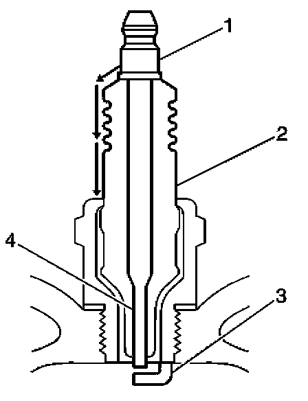 - Inspect the insulator (2) for cracks. All or part of the electrical charge may arc through the crack instead of the electrodes (3, 4).