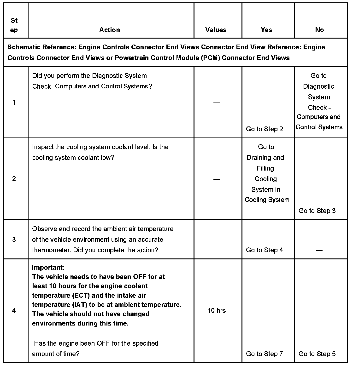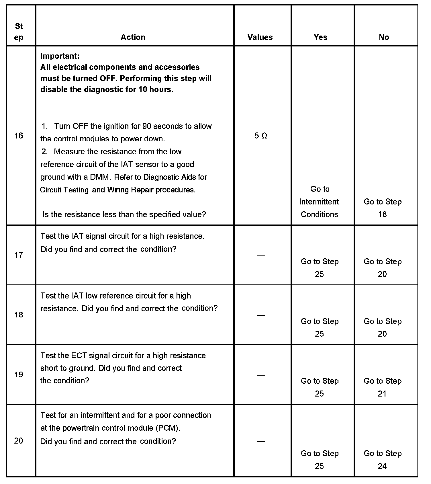 The numbers below refer to the step numbers on the diagnostic table.
