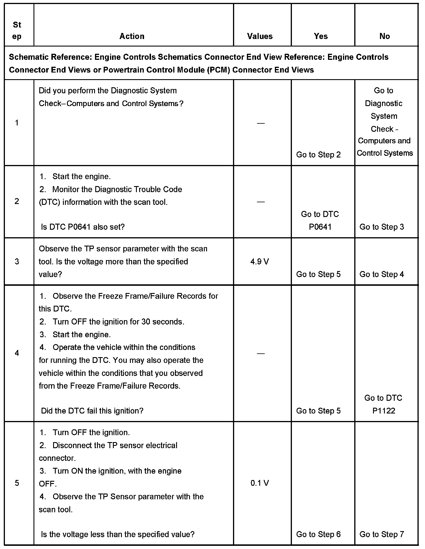 CIRCUIT DESCRIPTIONThe throttle position (TP) sensor is used by the powertrain control module (PCM) to determine the throttle plate angle for various engine management systems. The TP sensor is a potentiometer type sensor with a 5-volt reference circuit, a low reference circuit, and a signal circuit. The PCM provides the TP sensor with 5 volts on the 5-volt reference circuit and a ground on the low reference circuit. Rotation of the TP sensor rotor from the closed throttle position to the wide open throttle (WOT) position provides the PCM with a signal voltage from less than 1 volt to more than 4 volts through the TP sensor signal circuit. If the PCM detects an excessively high signal voltage, DTC P0123 sets.