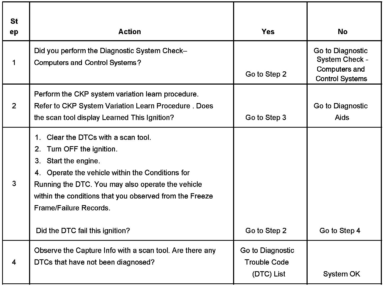 The PCM stores the CKP system variation values after a learn procedure has been performed. If the PCM detects the CKP system variation values are not stored in the PCM memory, DTC P0315 sets.