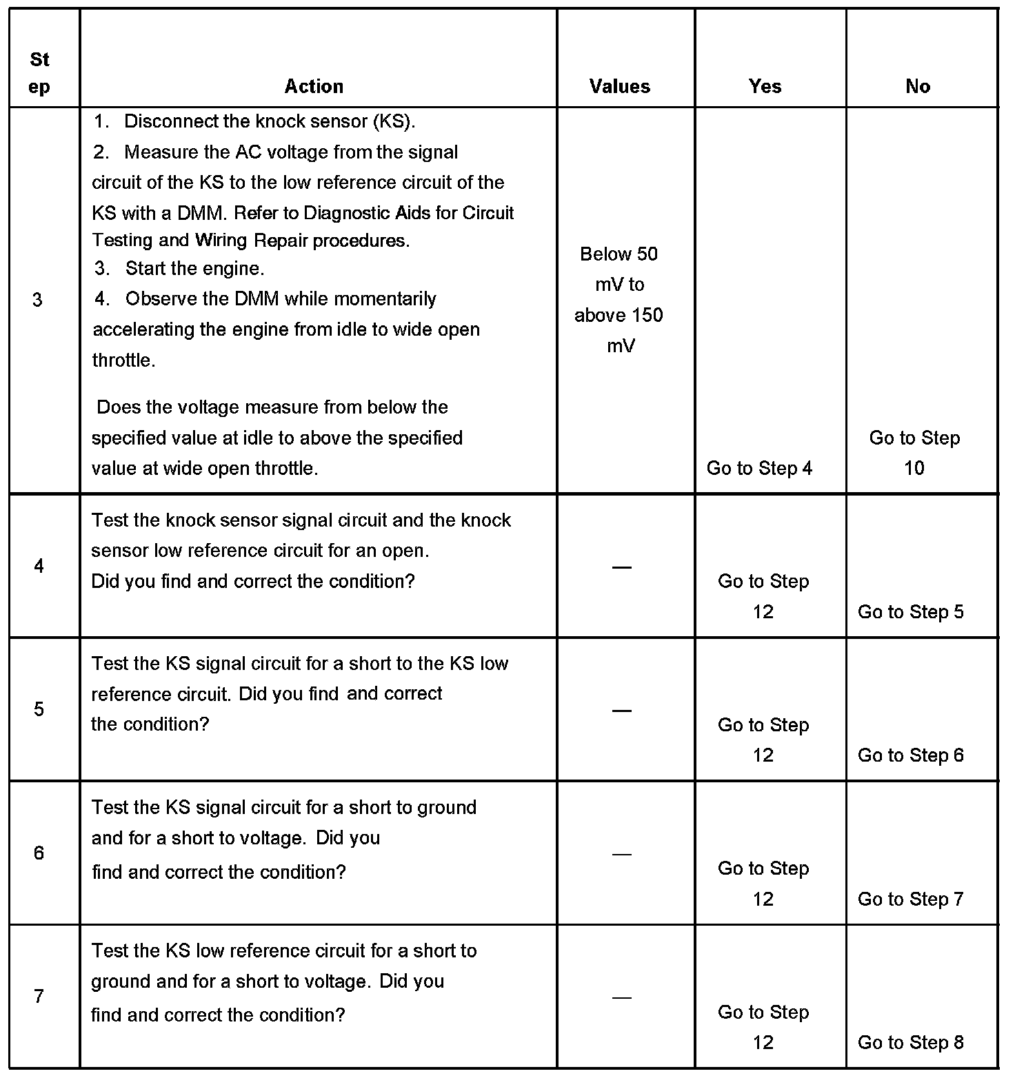 CIRCUIT DESCRIPTIONThe knock sensor (KS) produces an AC voltage at all engine speeds and loads. The powertrain control module (PCM) then adjusts the spark timing based on the amplitude and the frequency of the KS signal. The PCM uses the KS signal to calculate the average voltage range. The PCM checks the KS and related wiring by comparing the actual knock signal to the calculated voltage range. A normal KS signal should stay within the calculated voltage range. If the PCM detects that the KS signal is outside the calculated voltage range or not present DTC P0327 sets.