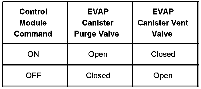 The table illustrates the relationship between the ON and OFF states, and the OPEN or CLOSED states of the EVAP canister purge and vent valves.