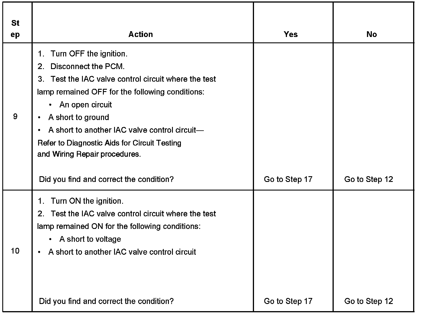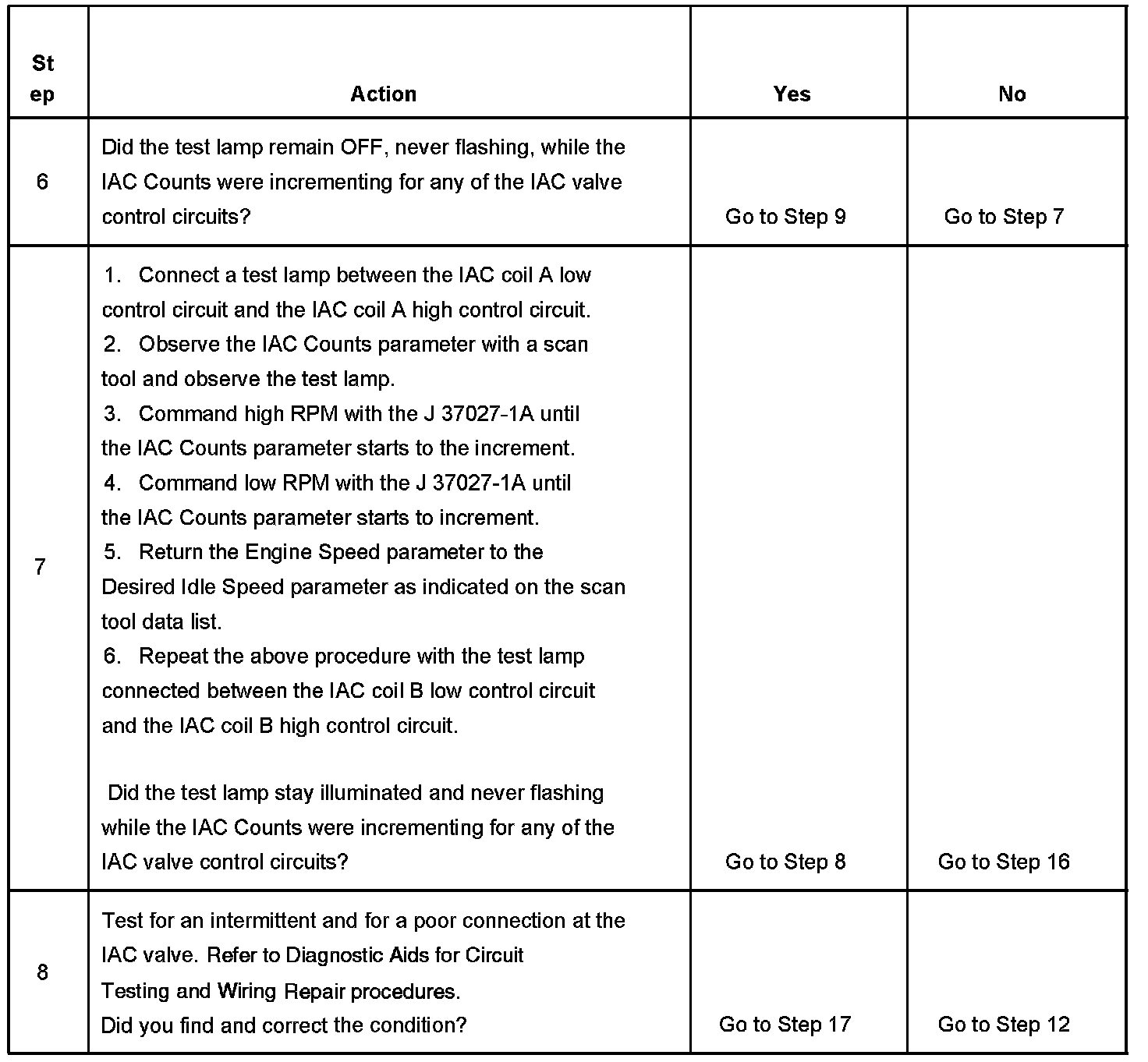 7. This test will determine the ability of the PCM to provide the IAC valve control circuits with a ground. On a normally operating system, the test lamp should not flash while the IAC Counts are incrementing.