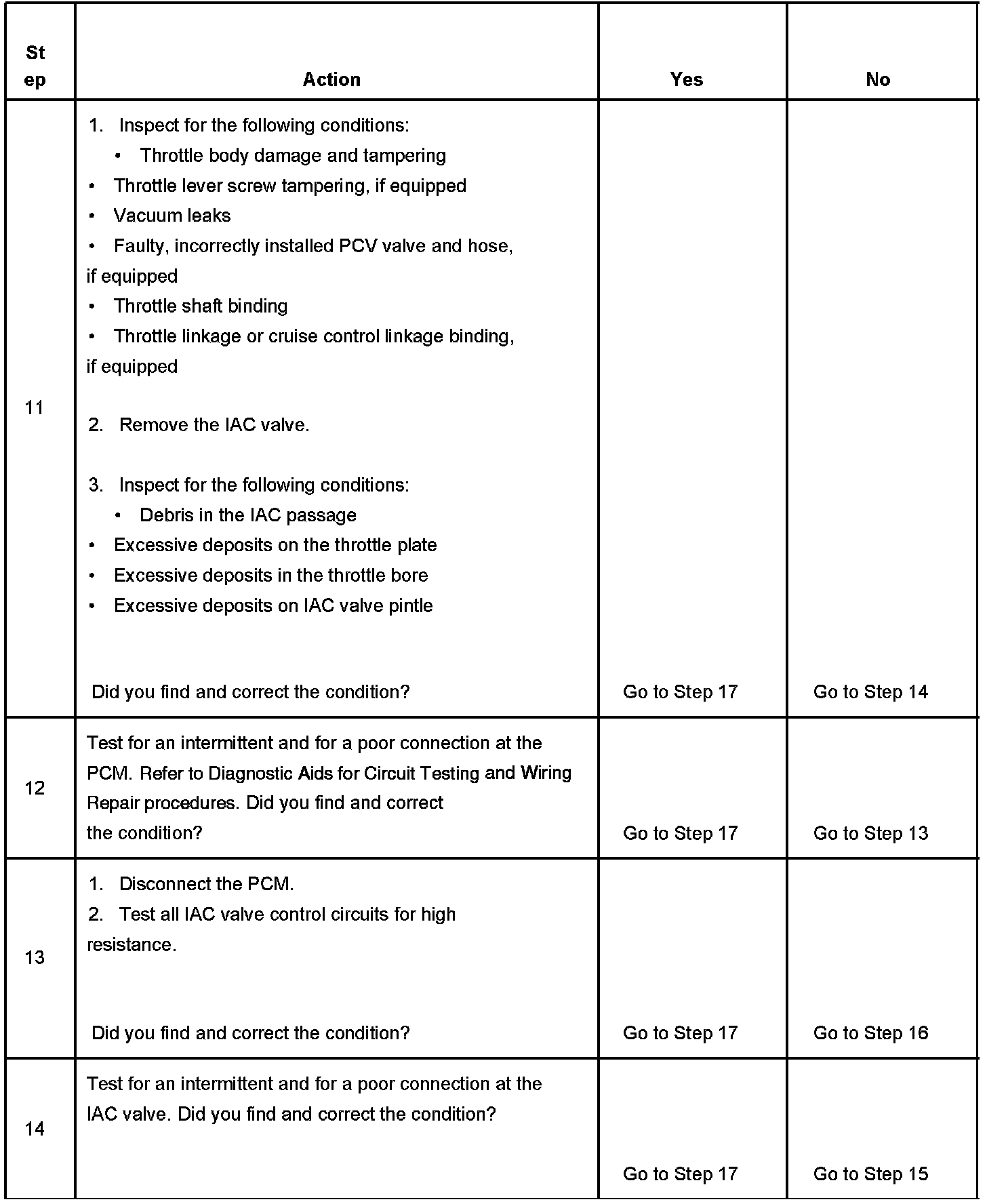 CIRCUIT DESCRIPTIONThe engine idle speed is controlled by the idle air control (IAC) valve. The IAC valve is on the throttle body. The IAC valve pintle moves in and out of an idle air passage bore to control air flow around the throttle plate. The IAC valve consists of a movable pintle, driven by a gear attached to an electric motor called a stepper motor. The stepper motor is capable of highly accurate rotation, or of movement, called steps. The stepper motor has 2 separate windings that are called coils. Each coil is supplied current by two circuits from the powertrain control module (PCM). When the PCM changes polarity of a coil, the stepper motor moves one step. The PCM uses a predetermined number of counts to determine the IAC pintle position. Observe IAC counts with a scan tool. The IAC counts will increment up or down as the PCM attempts to change the IAC valve pintle position. An IAC Reset will occur when the ignition key is turned OFF. First, the PCM will seat the IAC pintle in the idle air passage bore. Second, the PCM will retract the pintle a predetermined number of counts to allow for efficient engine start-up. If the engine idle speed is out of range for a calibrated period of time, an idle speed diagnostic trouble code (DTC) sets.