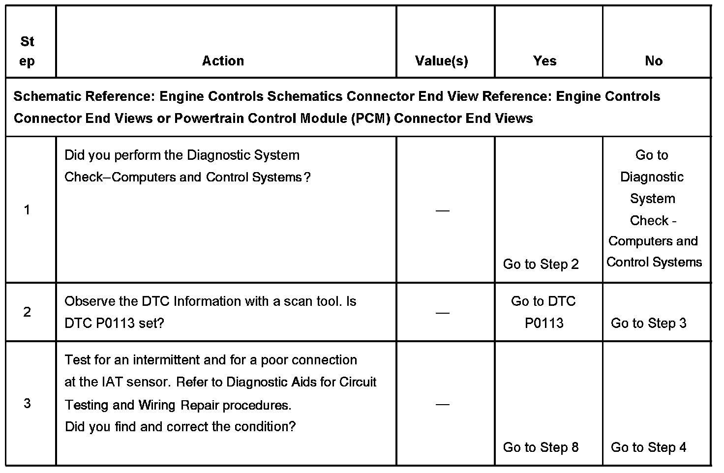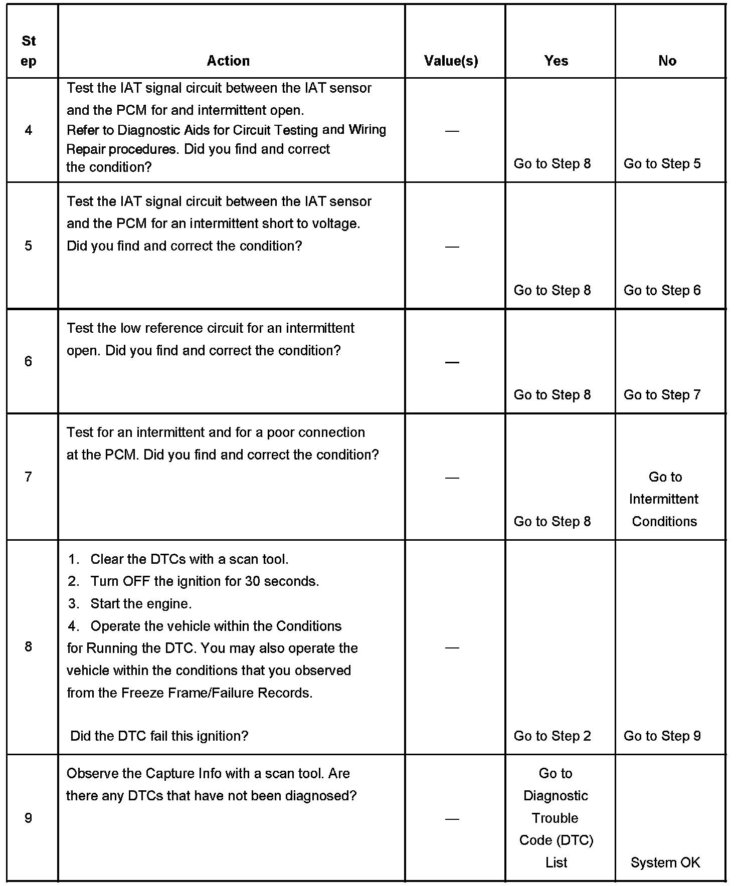 CIRCUIT DESCRIPTIONThe intake air temperature (IAT) sensor is a variable resistor. The IAT sensor has a signal circuit and a low reference circuit. The IAT sensor measures the temperature of the air entering the engine. The powertrain control module (PCM) supplies 5 volts to the IAT signal circuit and a ground for the IAT low reference circuit. When the IAT sensor is cold, the sensor resistance is high. When the air temperature increases, the sensor resistance decreases. With high sensor resistance, the PCM detects a high voltage on the IAT signal circuit. With lower sensor resistance, the PCM detects a lower voltage on the IAT signal circuit. If the PCM detects an intermittent high IAT signal voltage, indicating a low temperature, DTC P1111 sets.