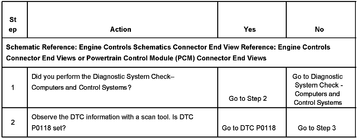 CIRCUIT DESCRIPTIONThe engine coolant temperature (ECT) sensor is a variable resistor, that measures the temperature of the engine coolant. The powertrain control module (PCM) supplies 5 volts to the ECT signal circuit and a ground for the ECT low reference circuit. When the ECT is cold, the sensor resistance is high. When the ECT increases, the sensor resistance lowers. With high sensor resistance, the PCM detects a high voltage on the ECT signal circuit. With lower sensor resistance, the PCM detects a lower voltage on the ECT signal circuit. If the PCM detects an excessively high signal voltage, which is a low temperature indication, DTC P1115 sets.
