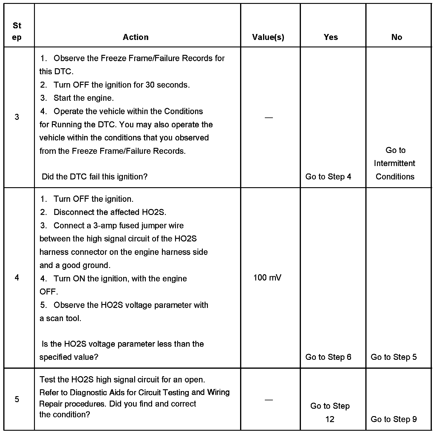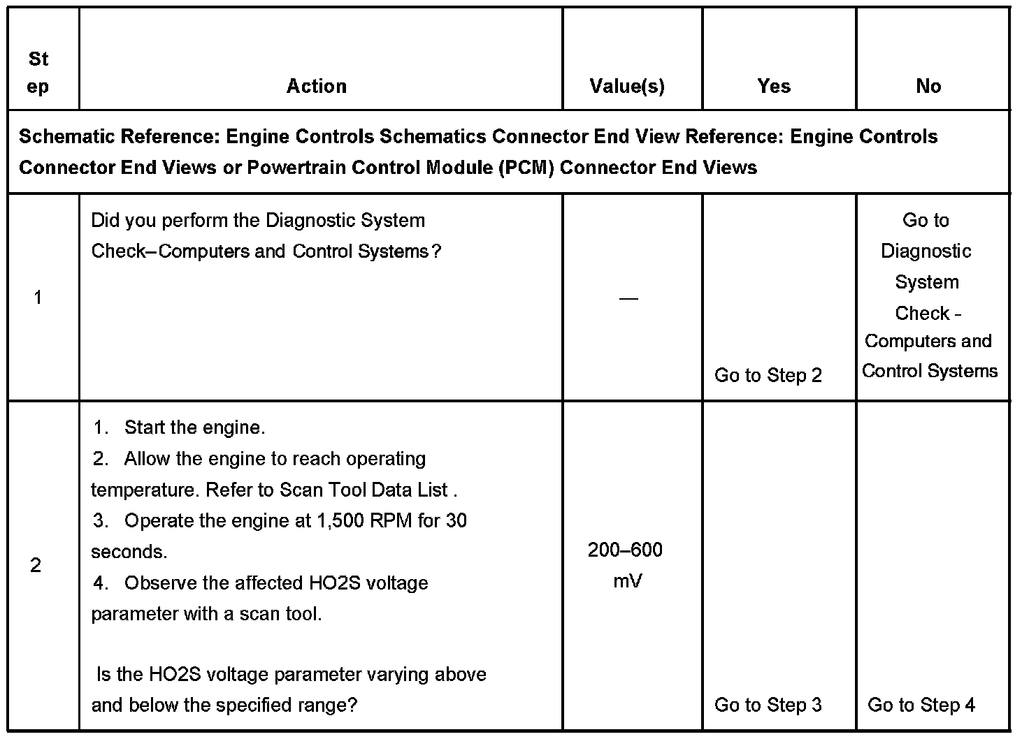 CIRCUIT DESCRIPTIONHeated oxygen sensors (HO2S) are used for fuel control and post catalyst monitoring. Each HO2S compares the oxygen content of the surrounding air with the oxygen content in the exhaust stream. The HO2S must reach operating temperature to provide an accurate voltage signal. Heating elements inside the HO2S minimize the time required for the sensors to reach operating temperature. The powertrain control module (PCM) supplies the HO2S with a reference, or bias, voltage of about 450 mV. When the engine is first started the PCM operates in open loop, ignoring the HO2S voltage signal. Once the HO2S reaches operating temperature and closed loop is achieved, the HO2S generates a voltage within a range of 0-1,000 mV that fluctuates above and below bias voltage. High HO2S voltage indicates a rich exhaust stream; low HO2S voltage indicates a lean exhaust stream. This diagnostic will only run once per ignition cycle. The PCM monitors the number of rich-to-lean and lean-to-rich transitions. A transition is defined as, the HO2S voltage changes from above 600 mV to below 200 mV or from below 200 mV to above 600 mV. If the PCM detects that the number of transitions were less than a specified value, DTCs P1133 or P1153 will set.