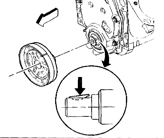 3. Apply a small amount of adhesive GM P/N 12346141 (Canadian P/N 1093433) or equivalent onto the crankshaft balancer keyway in order to seal the crankshaft balancer keyway and crankshaft joint.