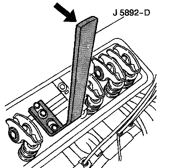 8. Use the J 5892-D in order to compress the valve spring. Hook the slotted end of J 5892-D under the washer on the valve rocker arm bolt.