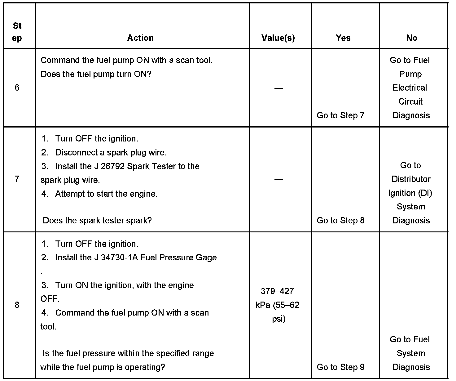 DESCRIPTIONThe Engine Cranks but Does Not Run diagnostic table is an organized approach to identifying a condition that prevents an engine from starting. The Engine Cranks but Does Not Run diagnostic table directs the service technician to the appropriate system diagnosis.