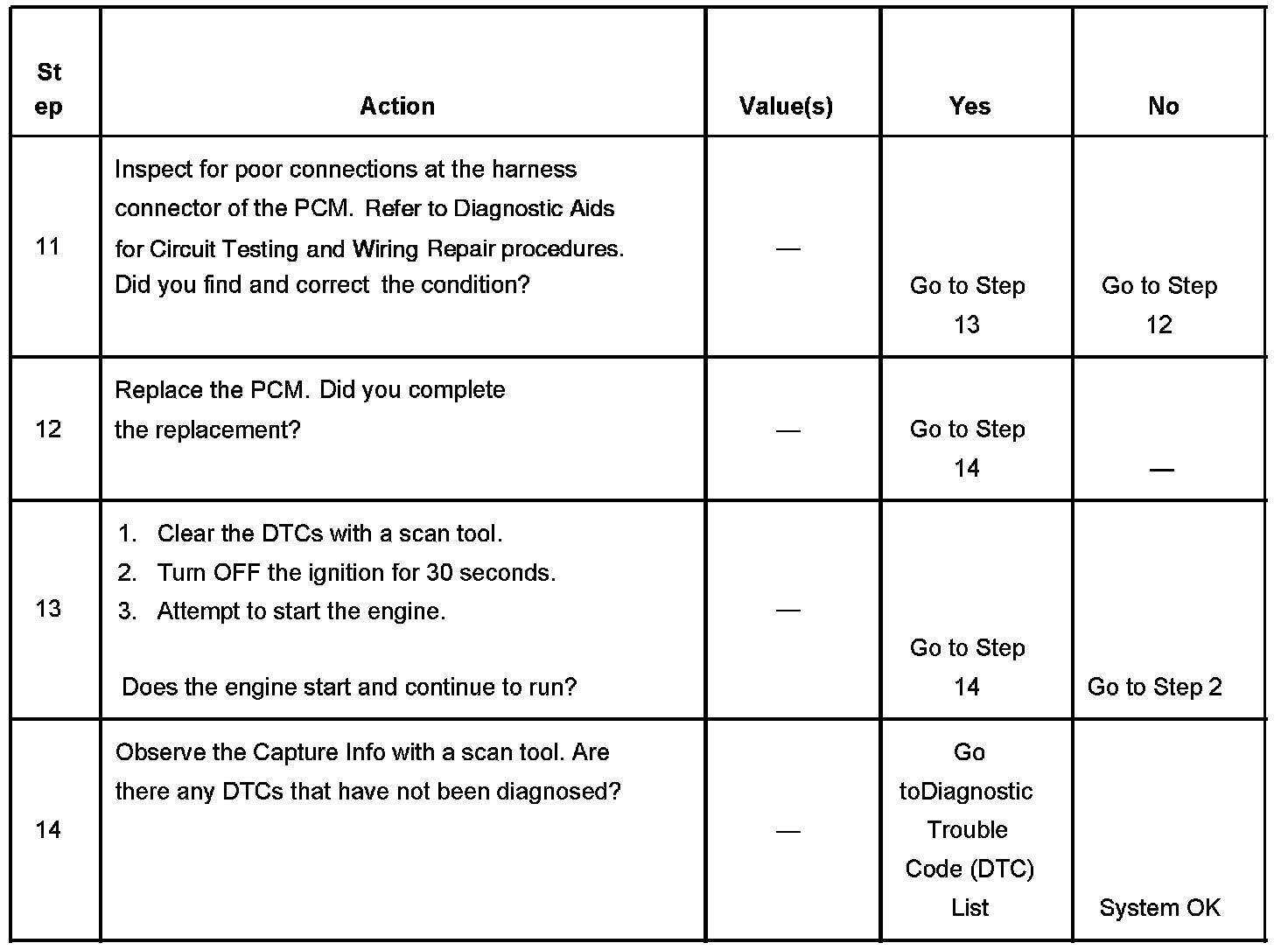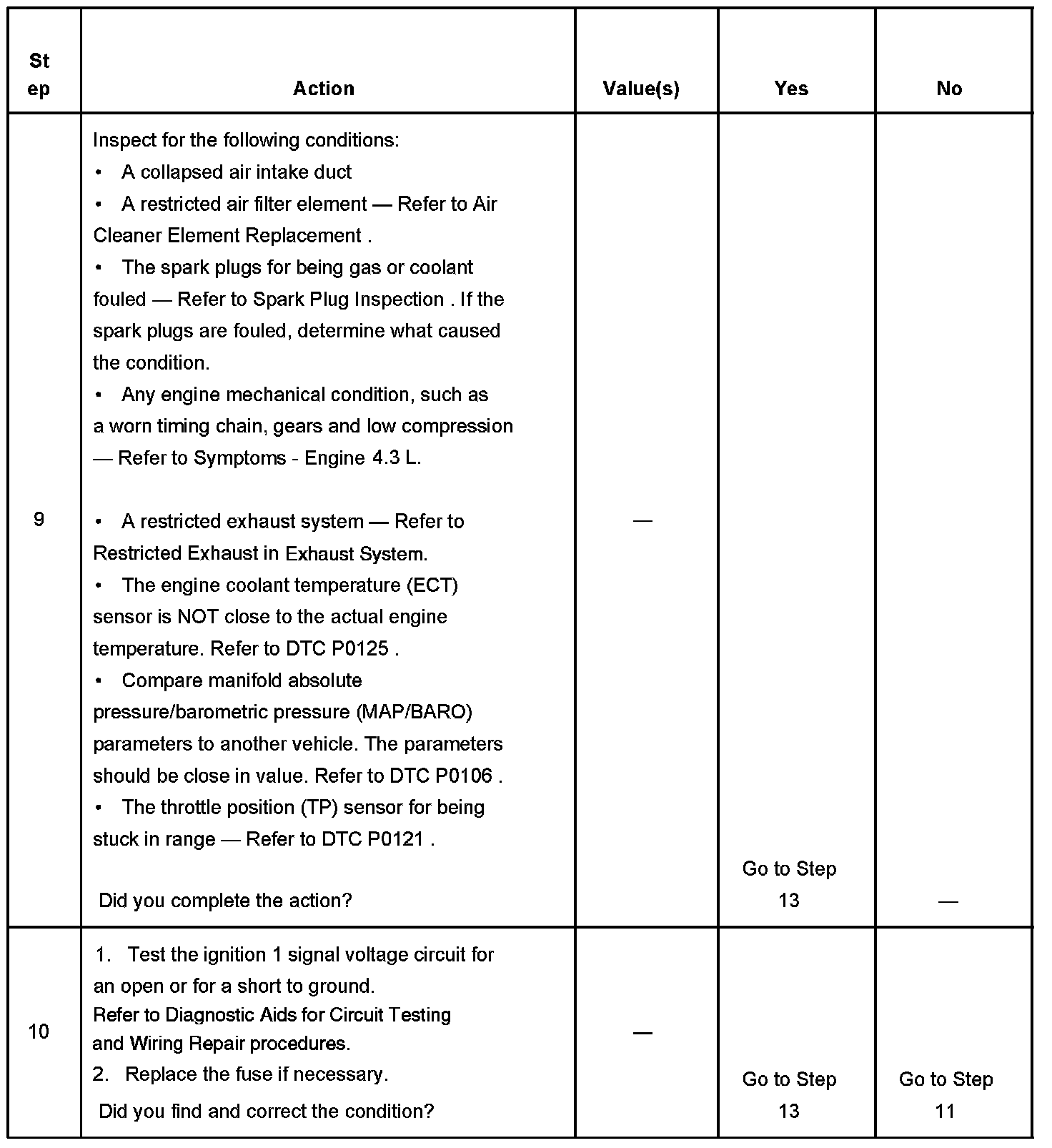 The Engine Cranks but Does Not Run diagnostic table assumes the following: