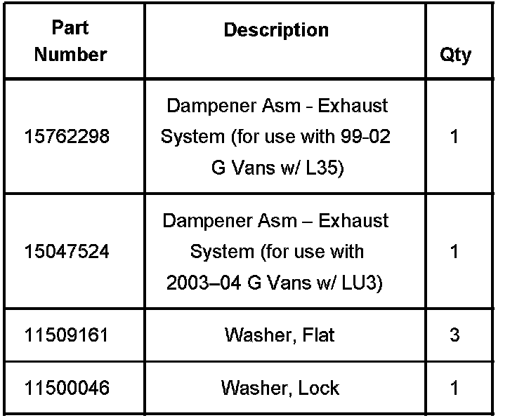 An exhaust system dampener assembly, tuned to 40.25 Hz, P/N 15762298, or 42 Hz, P/N 15047524, is available for service to correct this condition. Install the applicable exhaust system dampener assembly on the affected vehicles. Use the following procedure and the applicable part number listed below.