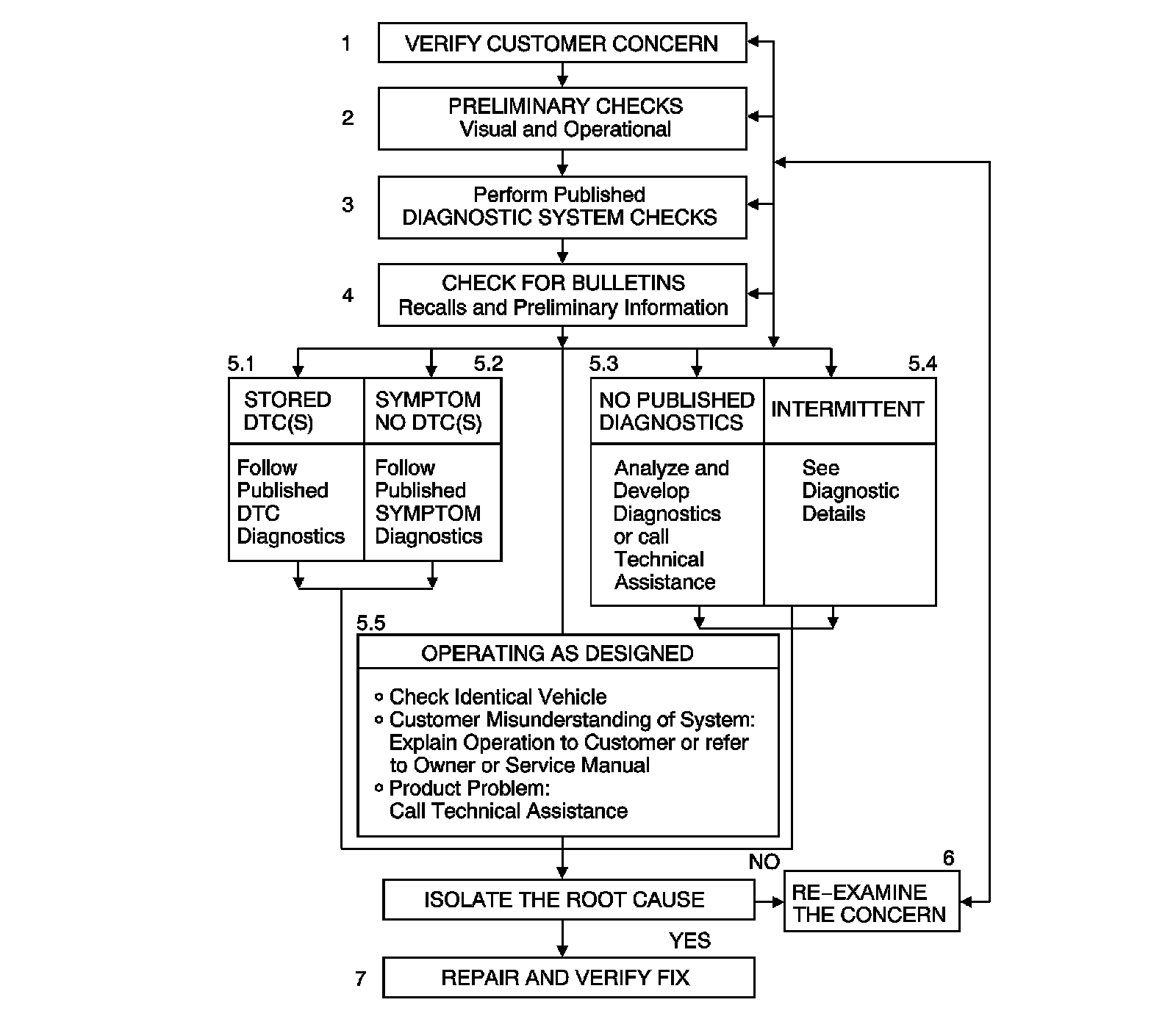 6 - Re-examine the Concern: If a technician cannot successfully find or isolate the concern, a re-evaluation is necessary. Re-verify the concern. The concern could be an intermittent or normal.