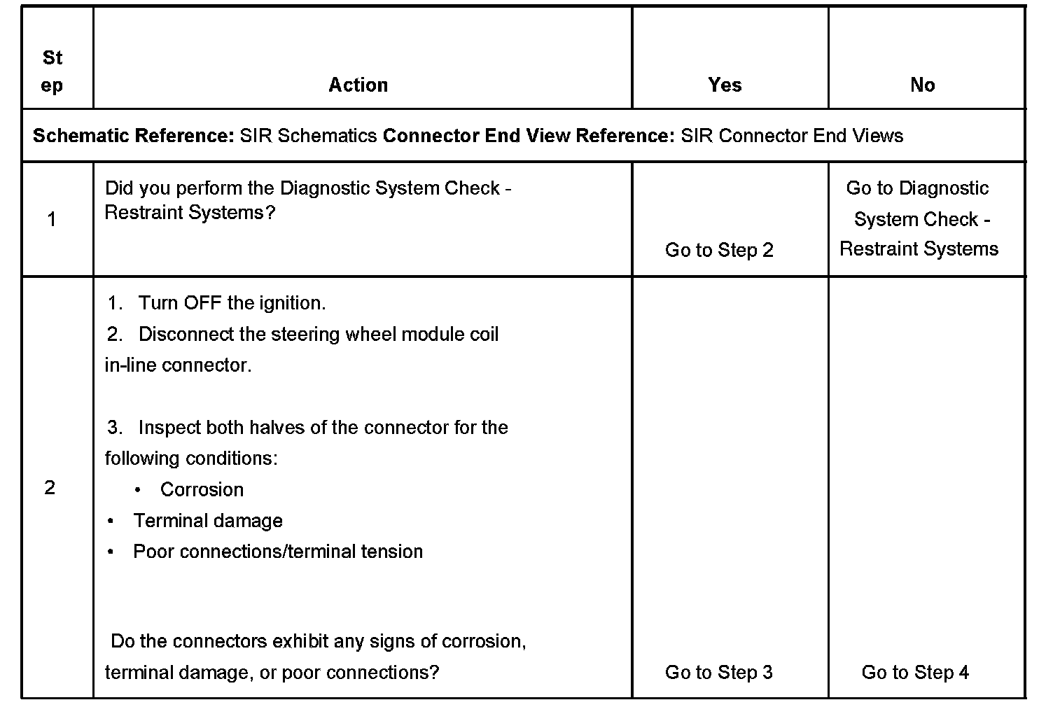 2. Inspects the steering wheel module coil in-line connector.