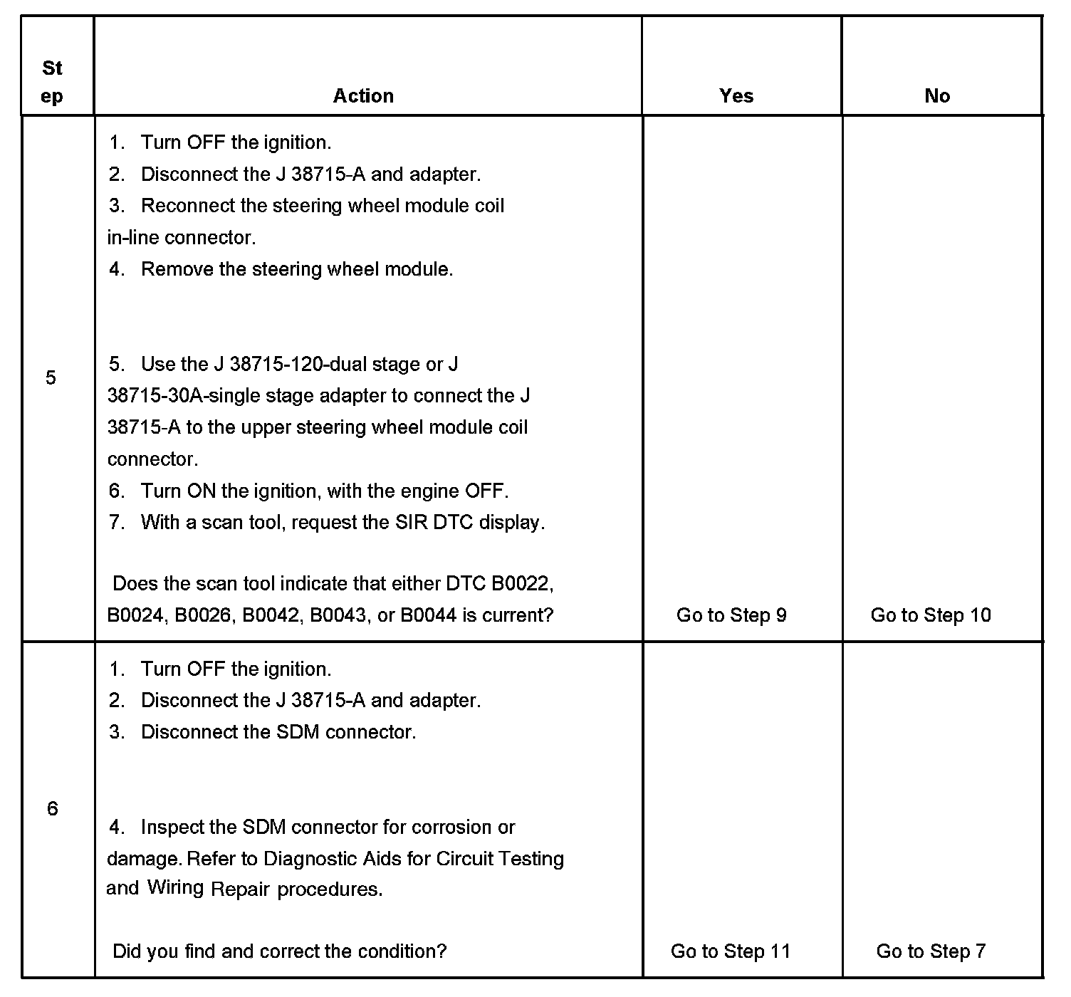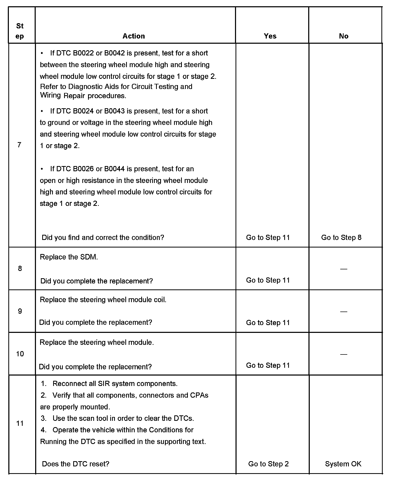 7. Tests for current DTCs. If DTC B0022 or B0042 is present, test for a short between the steering wheel module high and steering wheel module low control circuits for stage 1 or stage 2. If DTC B0024 or B0043 is present, test for a short to ground or voltage in the steering wheel module high and steering wheel module low control circuits for stage 1 or stage 2. If DTC B0026 or B0044 is present, test for an open or high resistance in the steering wheel module high and steering wheel module low control circuits for stage 1 or stage 2.