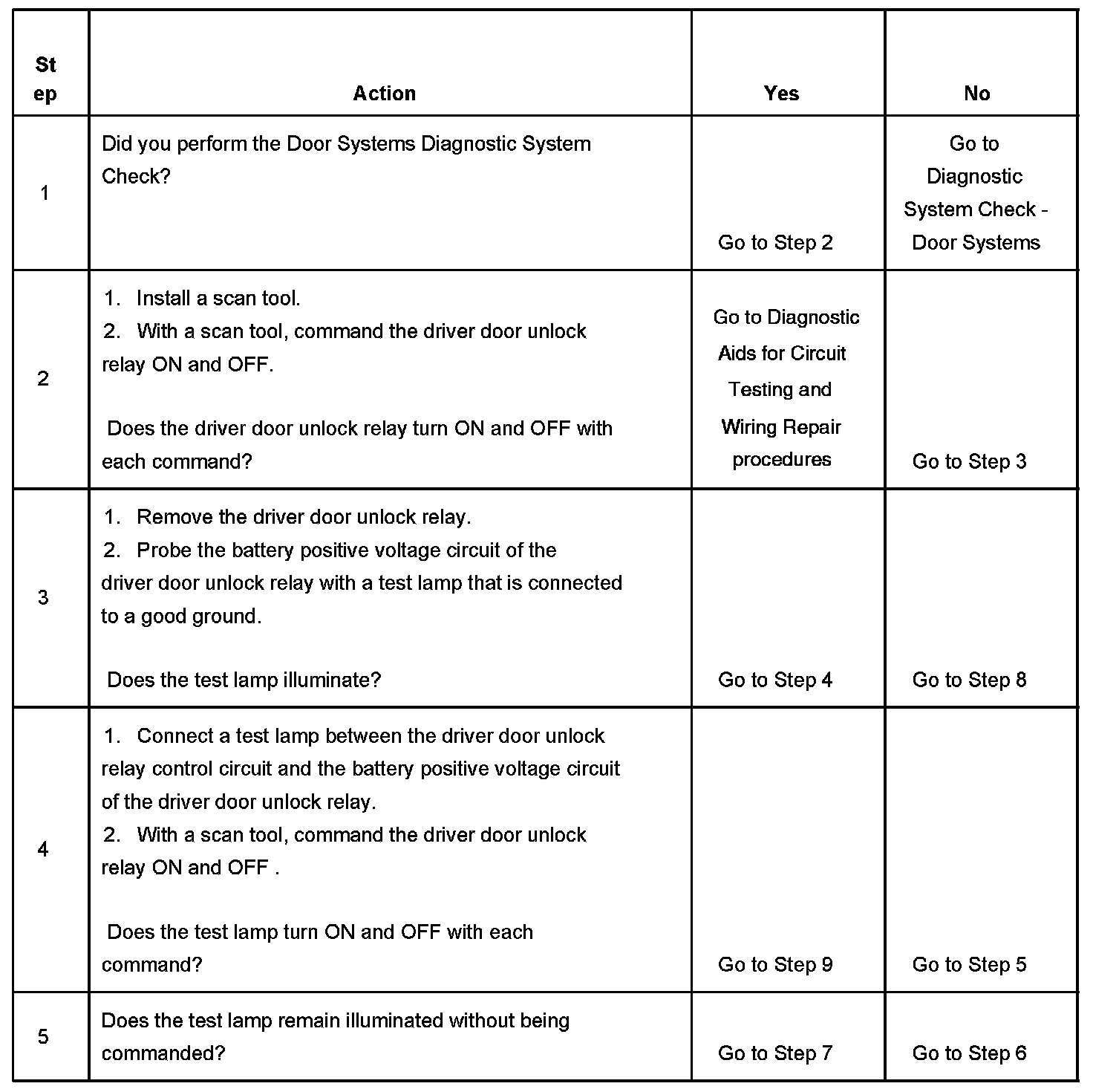 - If an open condition is present on the driver door unlock relay control circuit, the driver door will lock but not unlock.