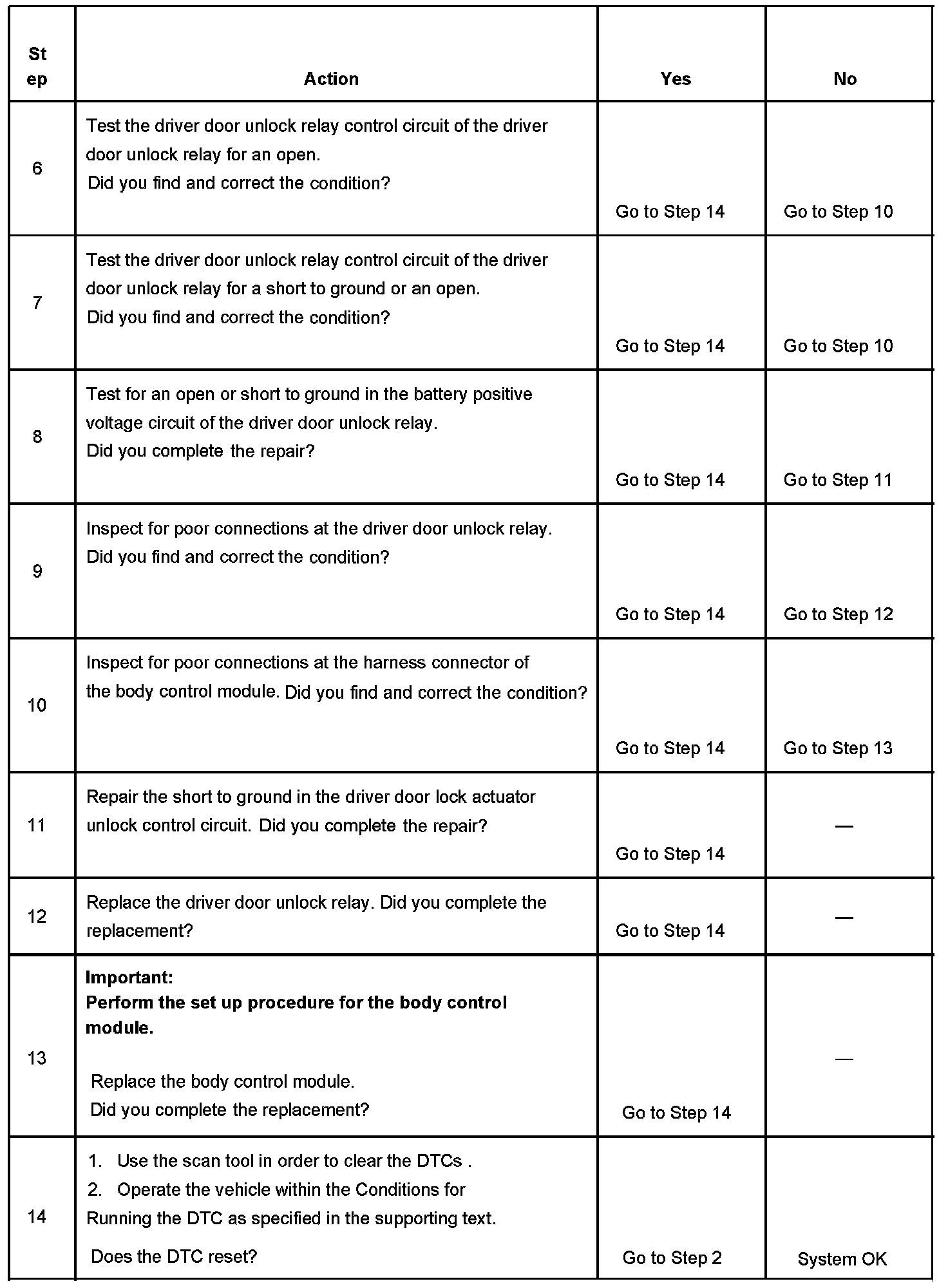 The DTC will set if the driver door unlock relay control circuit is shorted to ground or open for more then one second.