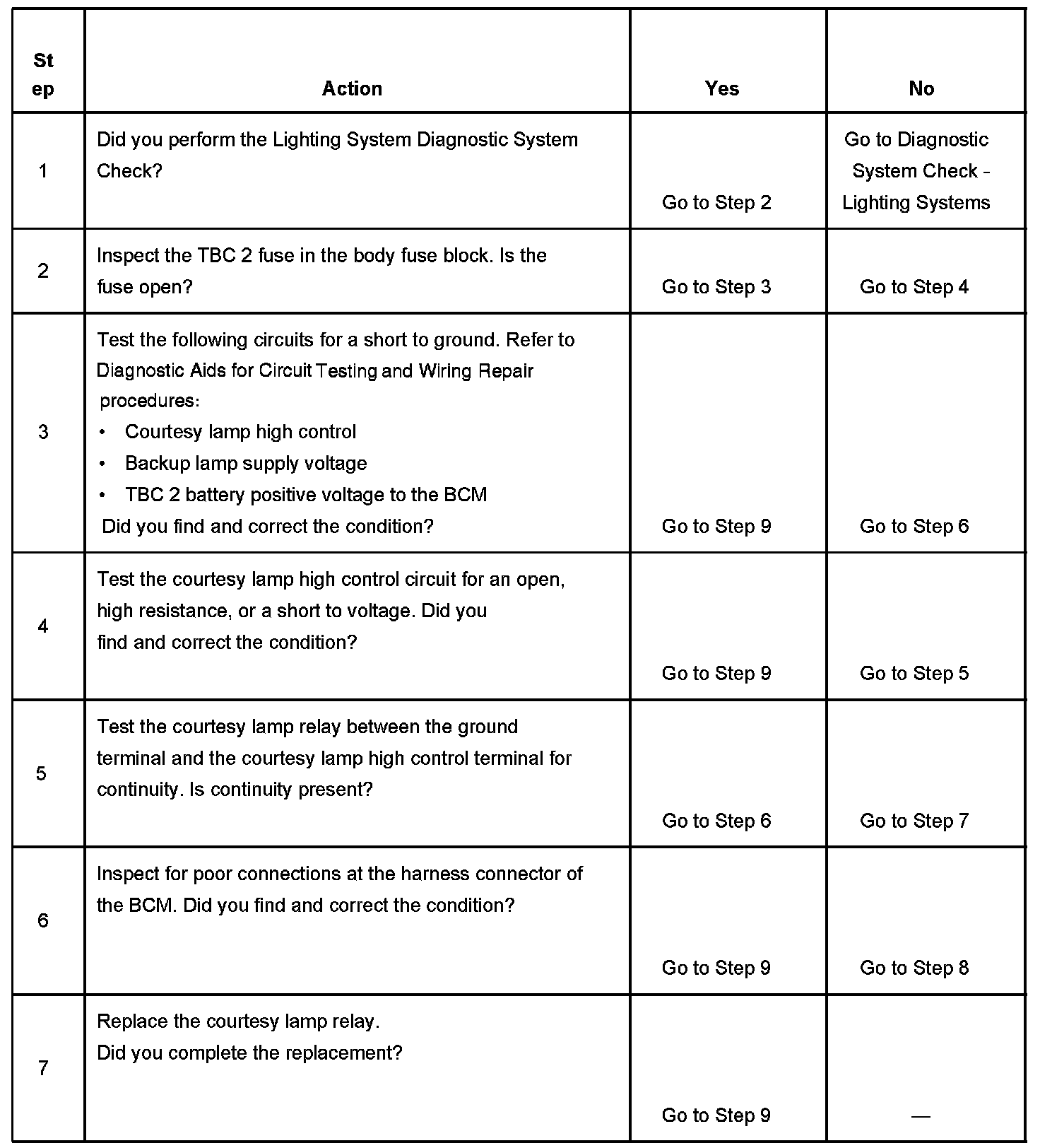 5. This step tests for an open coil in the courtesy lamp relay.