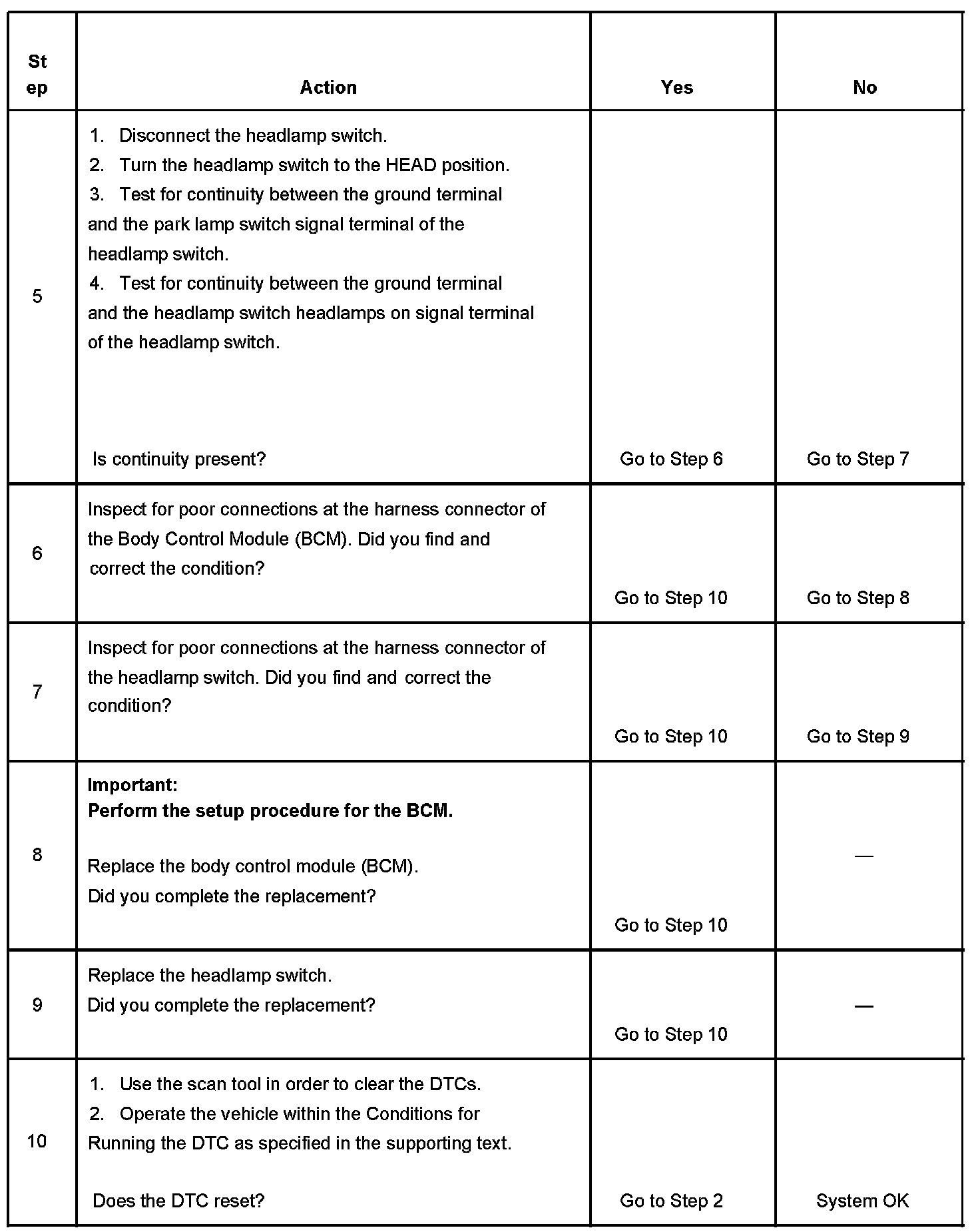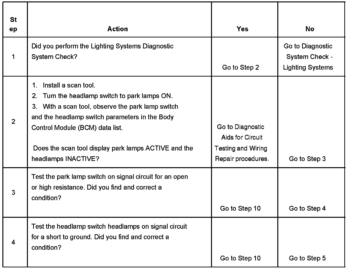 The body control module (BCM) monitors the park lamp switch on signal circuit and the headlamp switch headlamps on signal circuit in order to determine when the park lamps and headlamps should be illuminated. When the headlamp switch is turned to PARK, the BCM senses that the park lamp switch signal on circuit is grounded and the headlamps switch headlamps ON signal circuit is open. The BCM will then energize the park lamp relay illuminating the park lamps. When the headlamp switch is turned to HEAD, the BCM senses that the park lamp switch on signal circuit and the headlamp switch headlamps ON signal circuit are grounded. The BCM will then energize the park lamp relay and headlamp low beam relay or high beam relay illuminating the park lamps and headlamps.