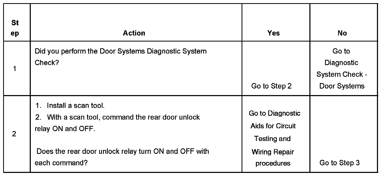 2. Listen for an audible click when the rear door unlock relay operates. Command both the ON and OFF states. Repeat the commands as necessary.