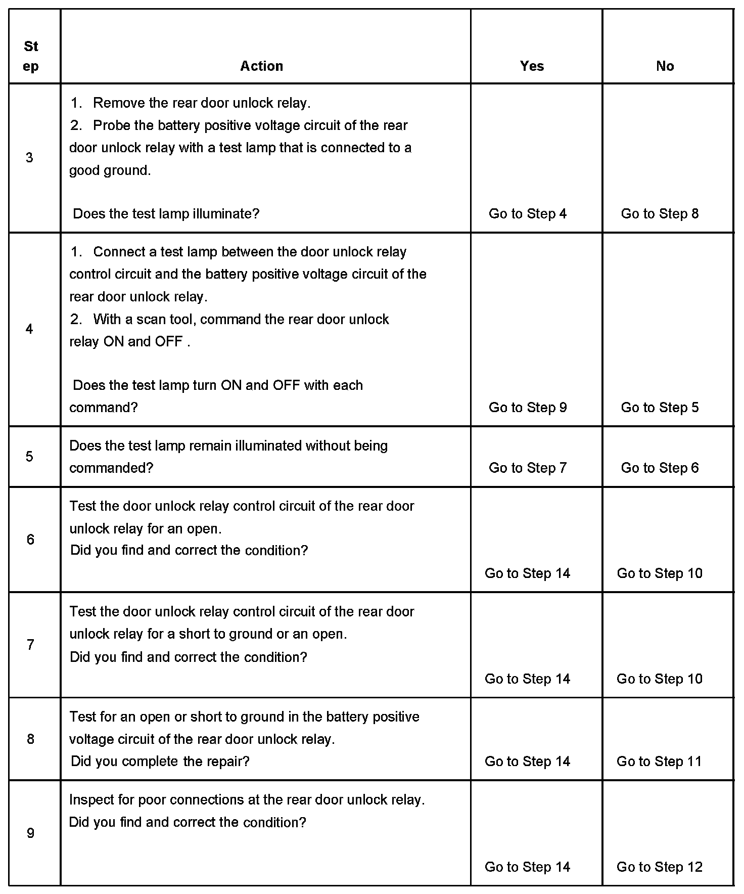 3. Tests for voltage at the coil side of the rear door unlock relay. The LOCKS fuse supplies power to the coil side of the rear door unlock relay.