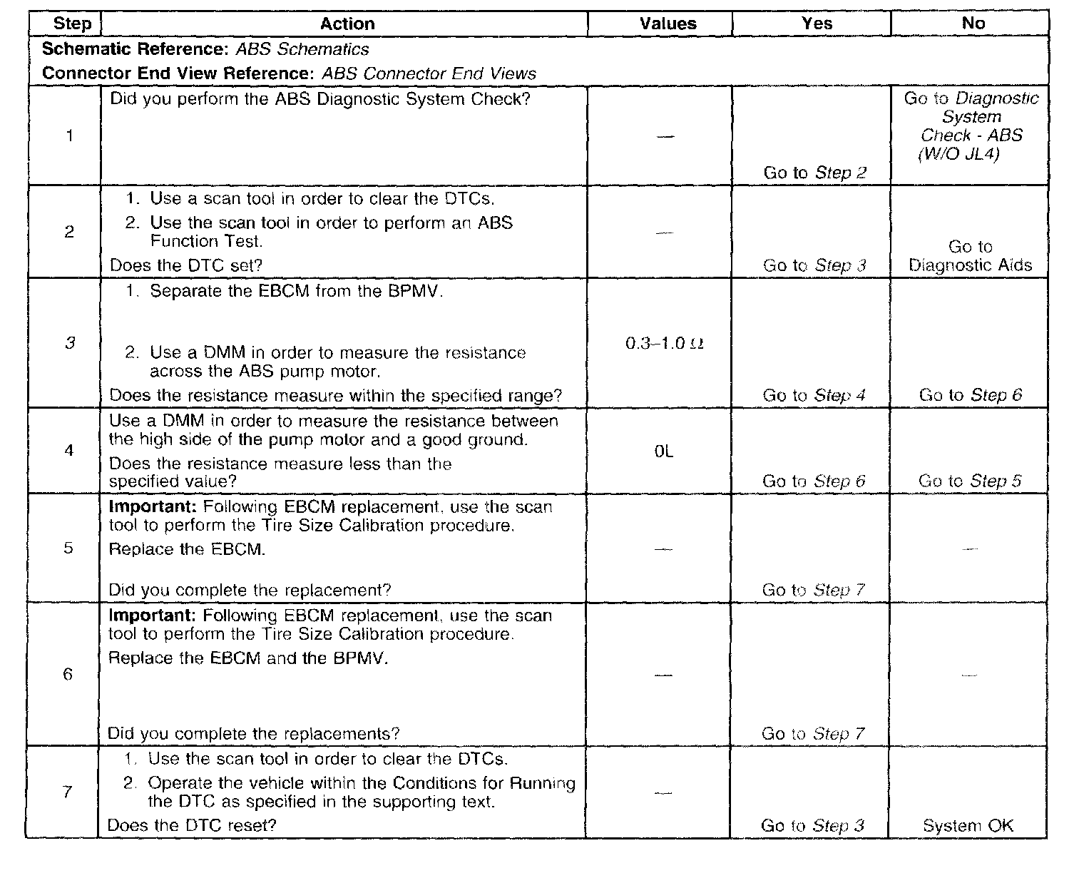 3. A shorted ABS pump motor may damage the contacts within the system relay. It is imperative that the steps in the table be followed to prevent damage to a replacement EBCM.
