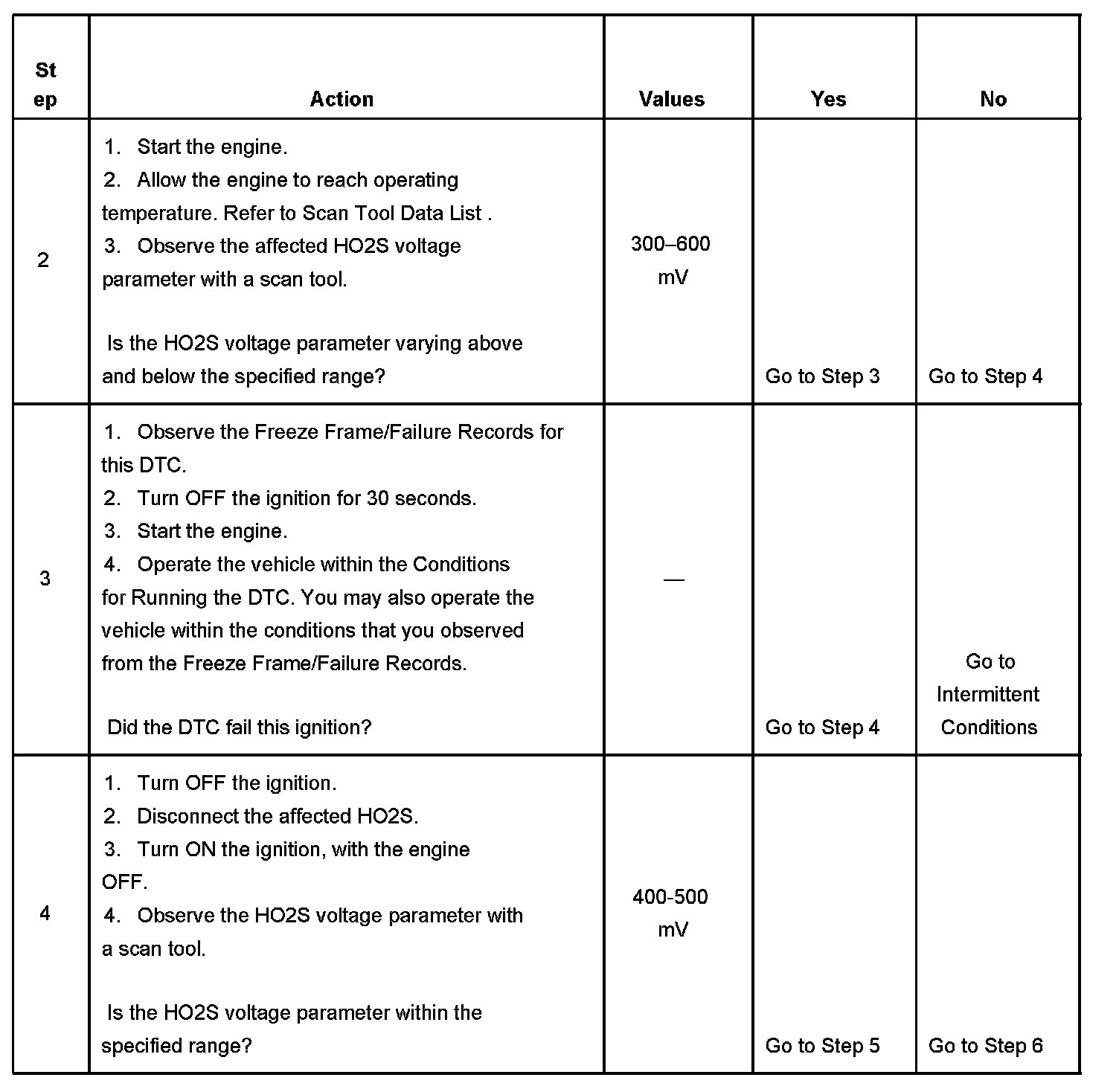 The PCM detects that the affected HO2S voltage parameter is more than 250 mV for 5 seconds.