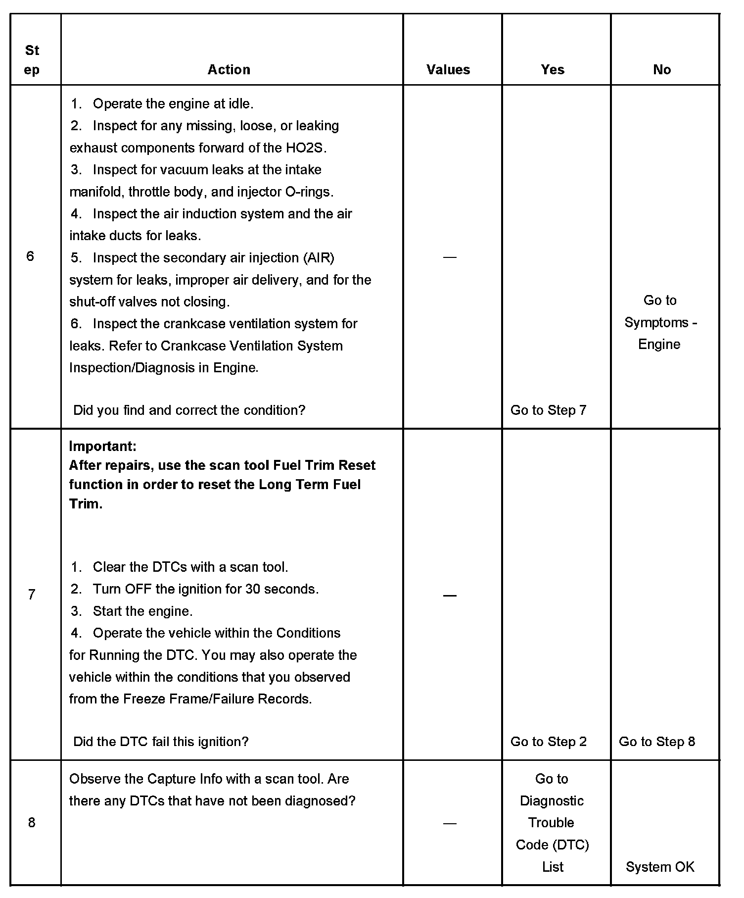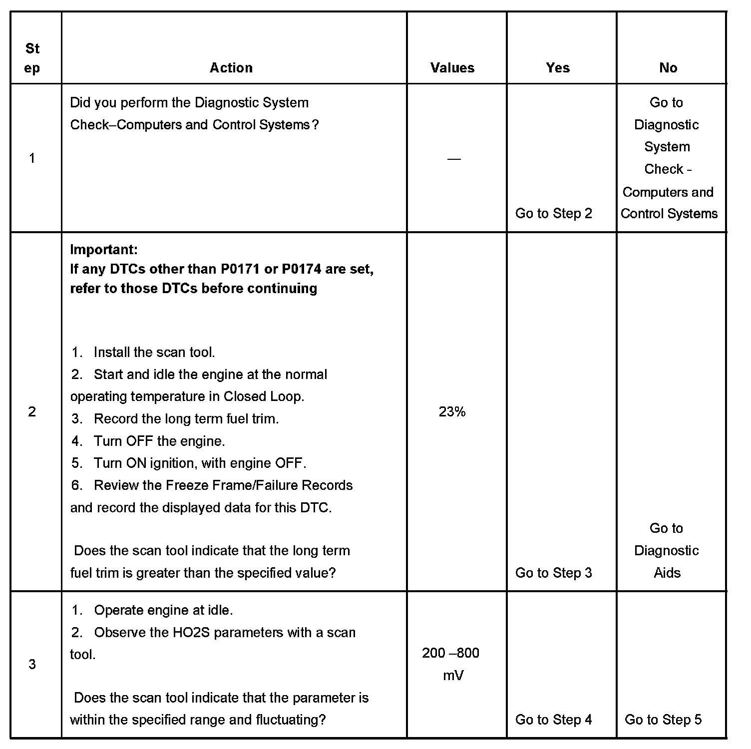 CIRCUIT DESCRIPTIONThe powertrain control module (PCM) controls the air/fuel metering system in order to provide the best possible combination of driveability, fuel economy, and emission control. Fuel delivery is controlled differently during Open and Closed Loop. During Open Loop, the PCM determines fuel delivery based on sensor signals without oxygen sensor (O2S) input. During Closed Loop, the O2S inputs are added and used by the PCM to calculate short and long term fuel trim fuel delivery adjustments. If the O2S indicate a lean condition, fuel trim values will be above 0 percent. If the O2S indicate a rich condition, fuel trim values will be below 0 percent. Short term fuel trim values change rapidly in response to the heated oxygen sensor (HO2S) voltage signals. Long term fuel trim makes coarse adjustments in order to maintain an air/fuel ratio of 14.7:1. If the PCM detects an excessively lean condition, DTC P0171 or P0174 sets.